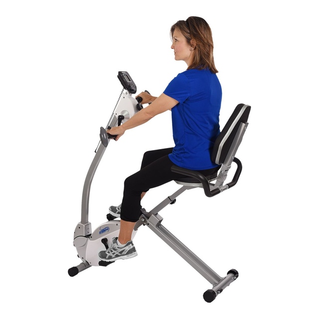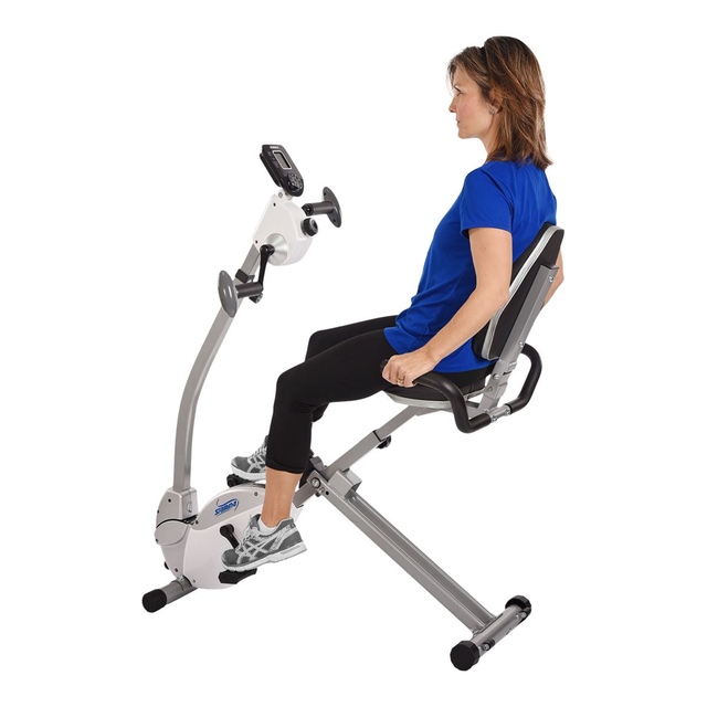 I am a 66 yr old woman who purchased the Stamina Recumbent Exercise Bike with Upper Body Exerciser following a shattered femur surgery to regain strength in my legs and arms after a length recovery period. I was able to assemble it independently. It is easy to use, adjust the pressure needed to pedal both arms and legs and measure, duration, calories burned, RPM’s and distance. It’s a great exercise bike for the money and I would buy it again