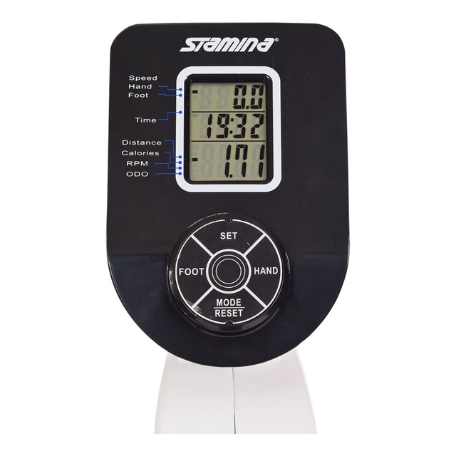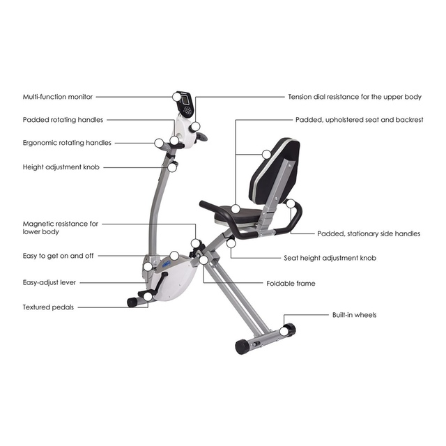 Introducing the Stamina Recumbent Exercise Bike with Upper Body Exerciser, a total body workout solution that targets both your upper and lower body. This bike helps improve cardiovascular endurance, mobility, and circulation. With eight levels of quiet resistance for the lower body and adjustable tension for the upper body, you can customize your workout intensity. The bike offers comfort with its low step-over design, padded handles, seat, and backrest. It also provides multiple height and seat adjustment options for a personalized fit. This product includes free access to müüv, a smart audio coaching app that helps you achieve a healthy lifestyle. After your workout, simply fold the frame and roll the bike away for easy storage.