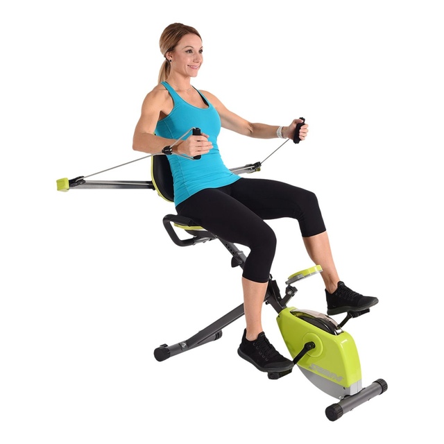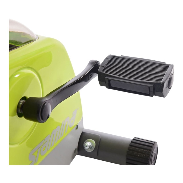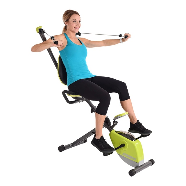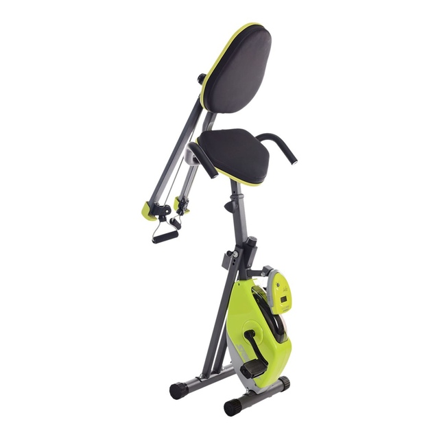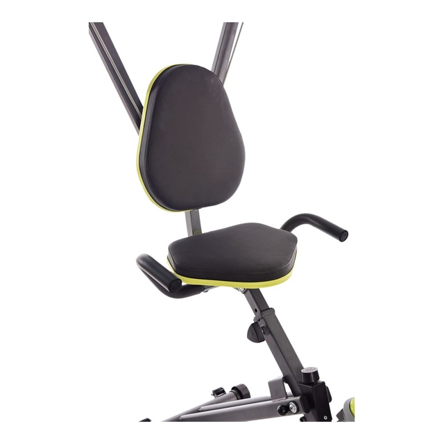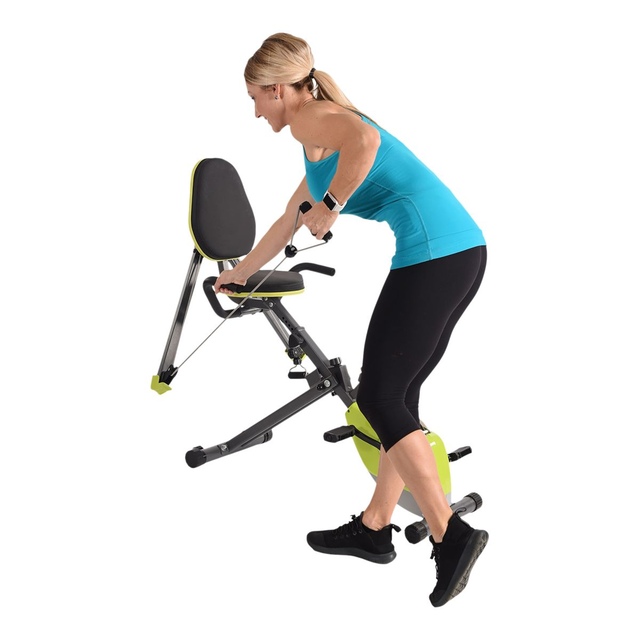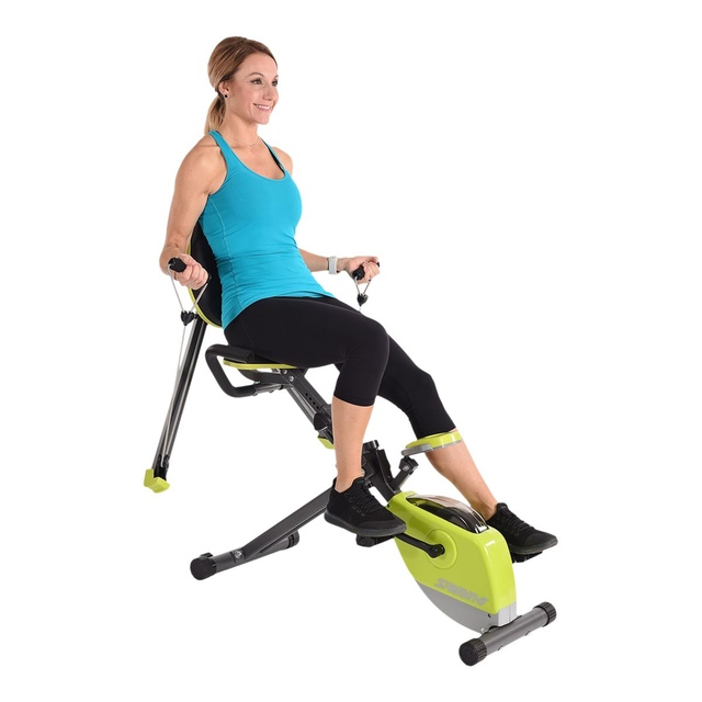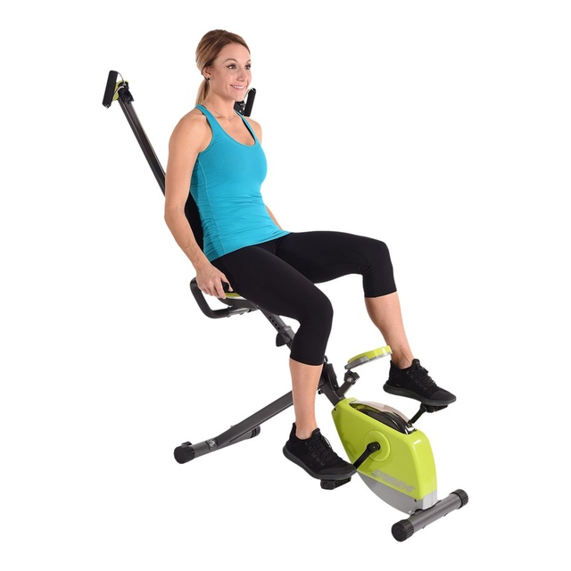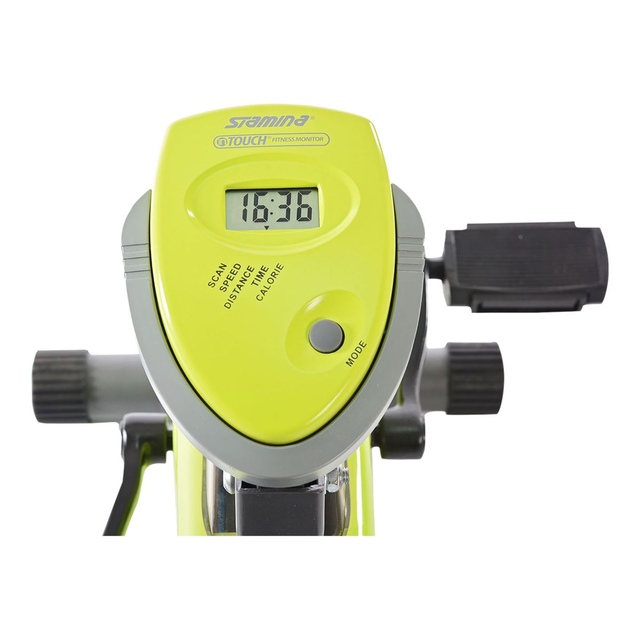 Introducing the Stamina Wonder Exercise Bike, a convenient and versatile workout solution for your whole body. The bike engages your core and legs, and with the included Wonder Arms, you can also strengthen and tone your arms, shoulders, chest, and back. The bungee cord and pulley system allows for smooth exercises like chest press, curls, and flies. The adjustable resistance dial and angle of the Wonder Arms provide a variety of upper-body exercises. The bike features a multi-function monitor to track your workout metrics, an adjustable seat height, and comfortable padded handlebars. This product includes free access to müüv, a smart audio coaching app that helps you achieve a healthy lifestyle. After your workout, easily transport the bike using the built-in wheels.