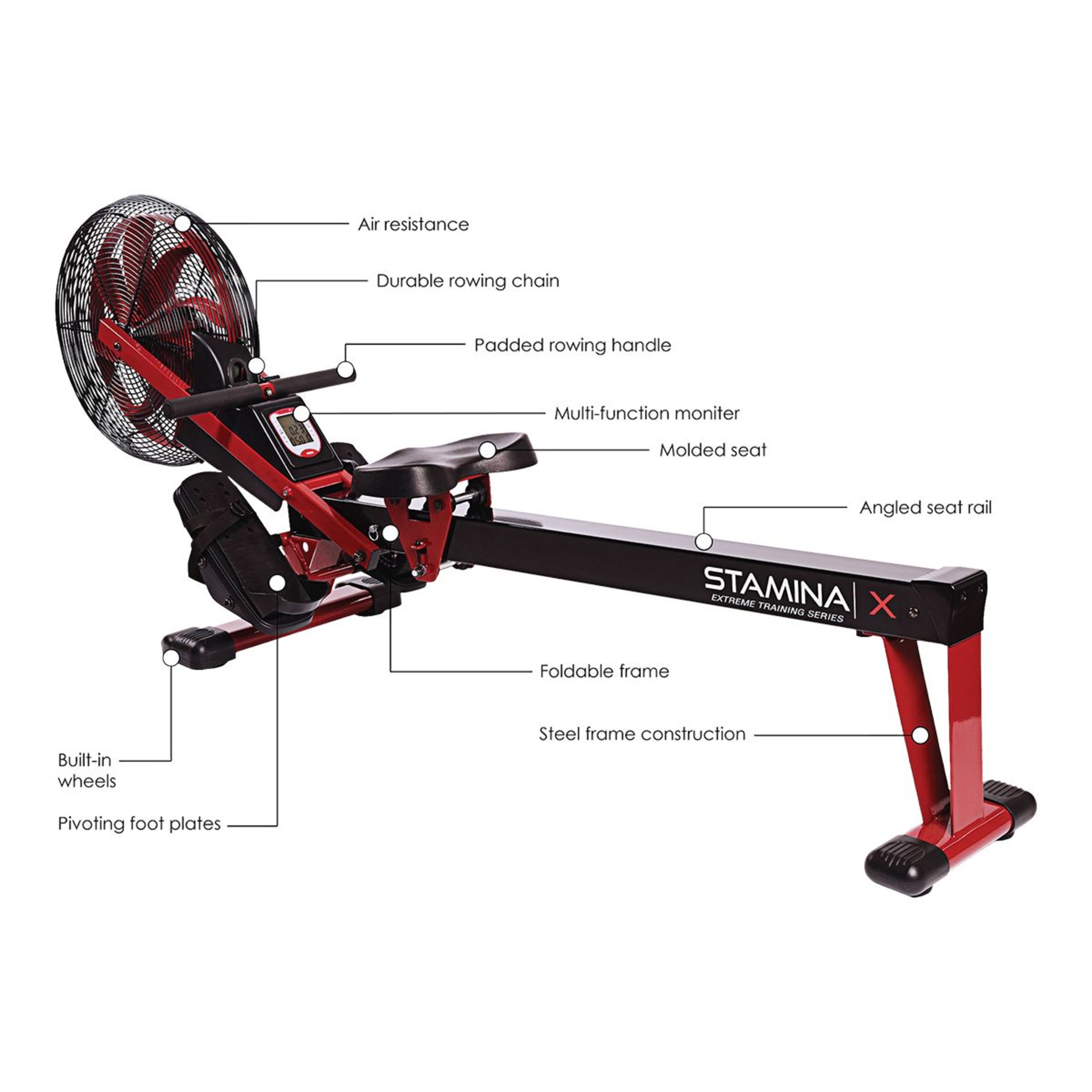 Introducing the Stamina Air Rower, a high-intensity workout solution designed to increase cardiovascular fitness and strengthen your entire body. This rowing machine offers the same elements as a commercial rower at an affordable price, allowing you to bring the gym experience into your home. The durable steel frame and rowing chain ensure a tough and long-lasting performance. The molded seat provides comfort during extended workouts, and the multi-function monitor tracks key measurements in real-time. This product includes free access to müüv, a smart audio coaching app that helps you achieve a healthy lifestyle. The rower can be easily folded and rolled away for convenient storage.