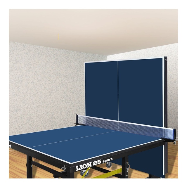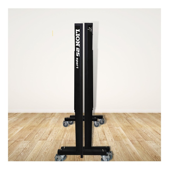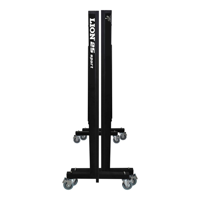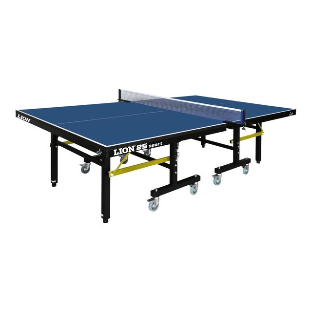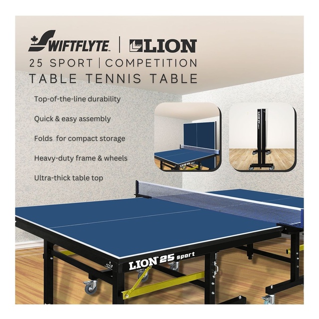 The Swiftflyte™ Lion® 25 Sport Competition table tennis table is a foldable, indoor ping pong table built to international standards with premium materials, ideal for tournament play, and intensive institutional and club use. The table comes almost entirely assembled out of the box, and only the wheels need to be attached for a fast and easy setup. The ultra-thick table-top gives a true bounce, while the heavy-duty undercarriage frame and wheels provide exceptional durability and longevity. The table is divided into two separate halves, which conveniently folds for compact storage, and allows for an adjustable-distance solo playback setup. Includes a deluxe clip-on clamp net and post set.