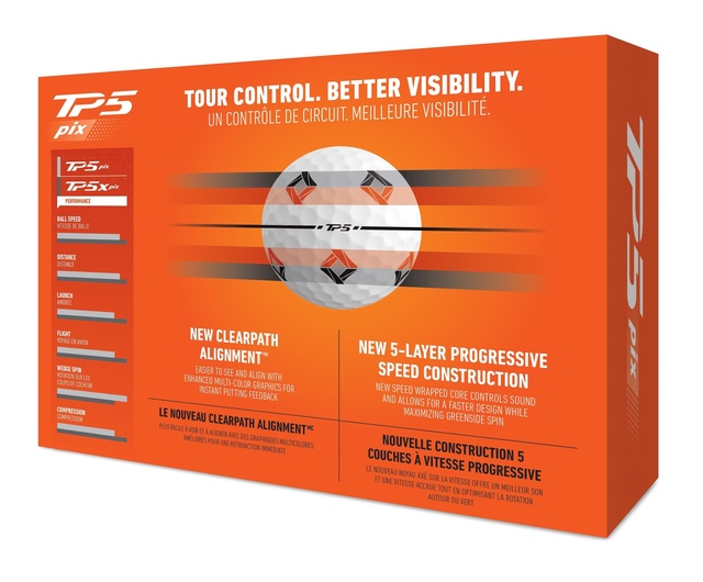 The 2024 TP5 pix™ golf ball builds on the groundbreaking visual technology of ClearPath Alignment™, the most played all-over print visual technology on professional tours. Compared to previous generations, the new model features a longer centerline and additional colour contrast, offering easier alignment and more precise feedback on the green.