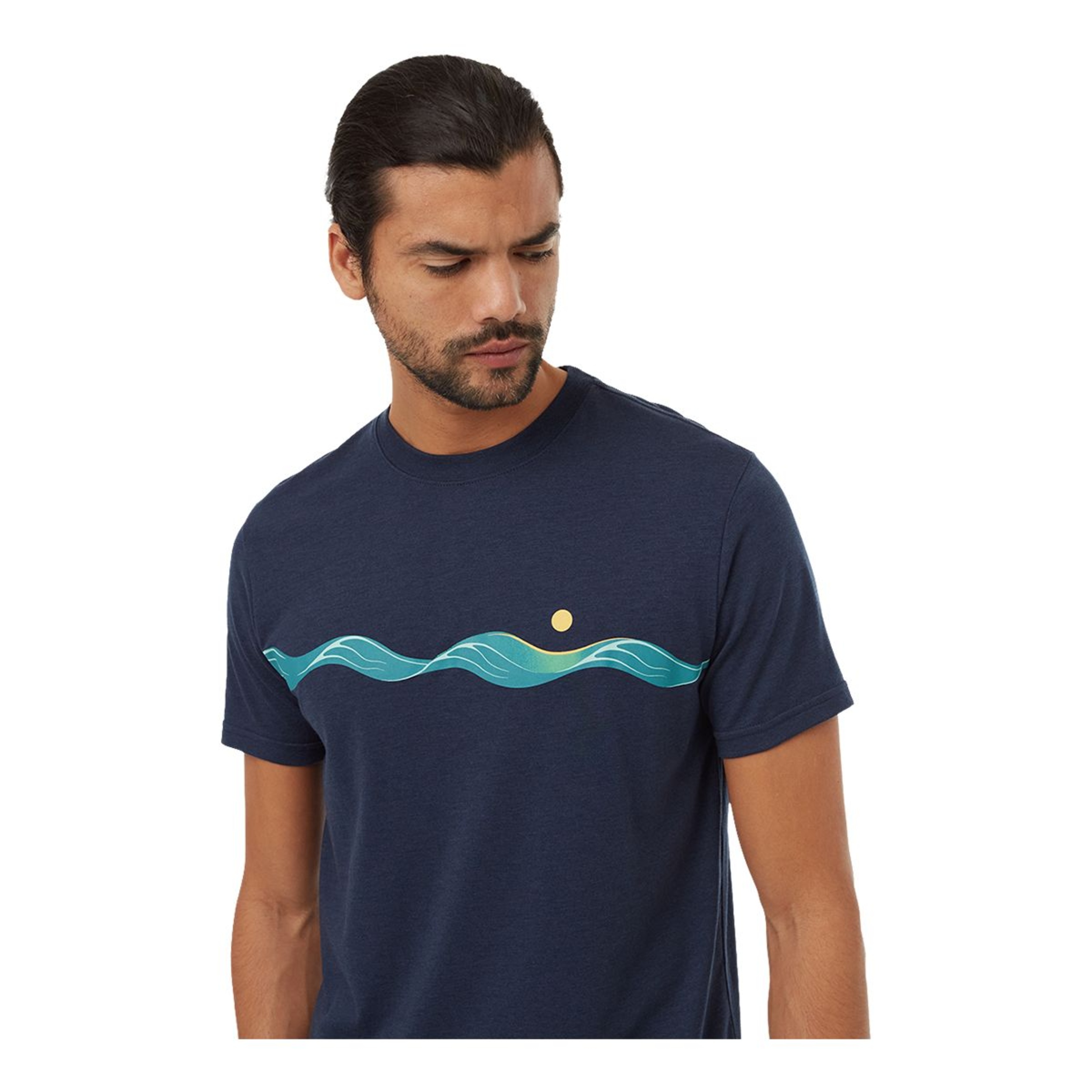 The tentree Men's Artist Waves T-shirt features artwork by Indigenous Canadian artist Luke Swinson. Made with sustainable practices, it supports planting cedar trees across Canada. The stretch knit fabric and set-in sleeves provide a relaxed fit. Cultural significance and style converge in this unique Artist Waves t shirt from tentree.