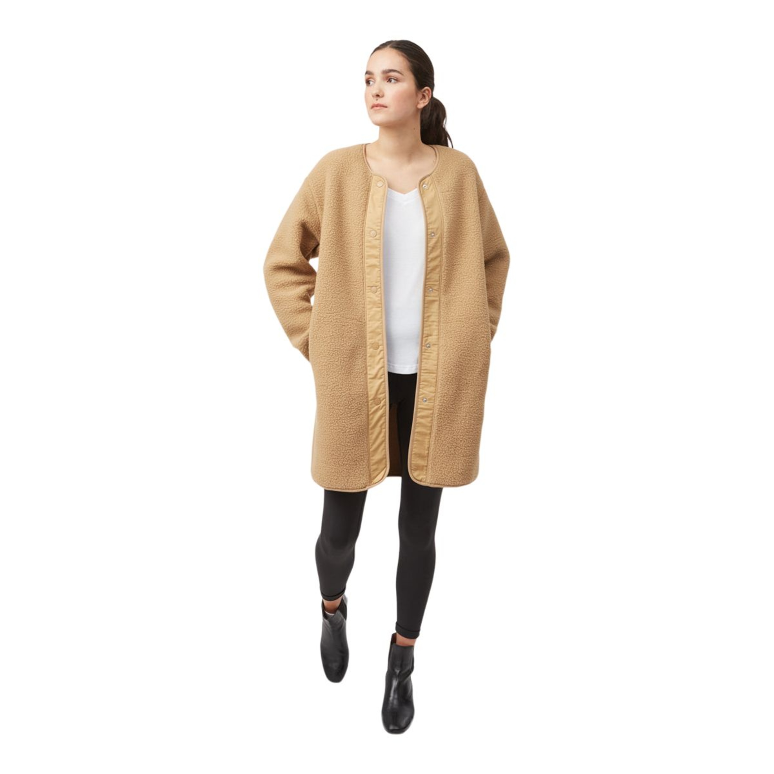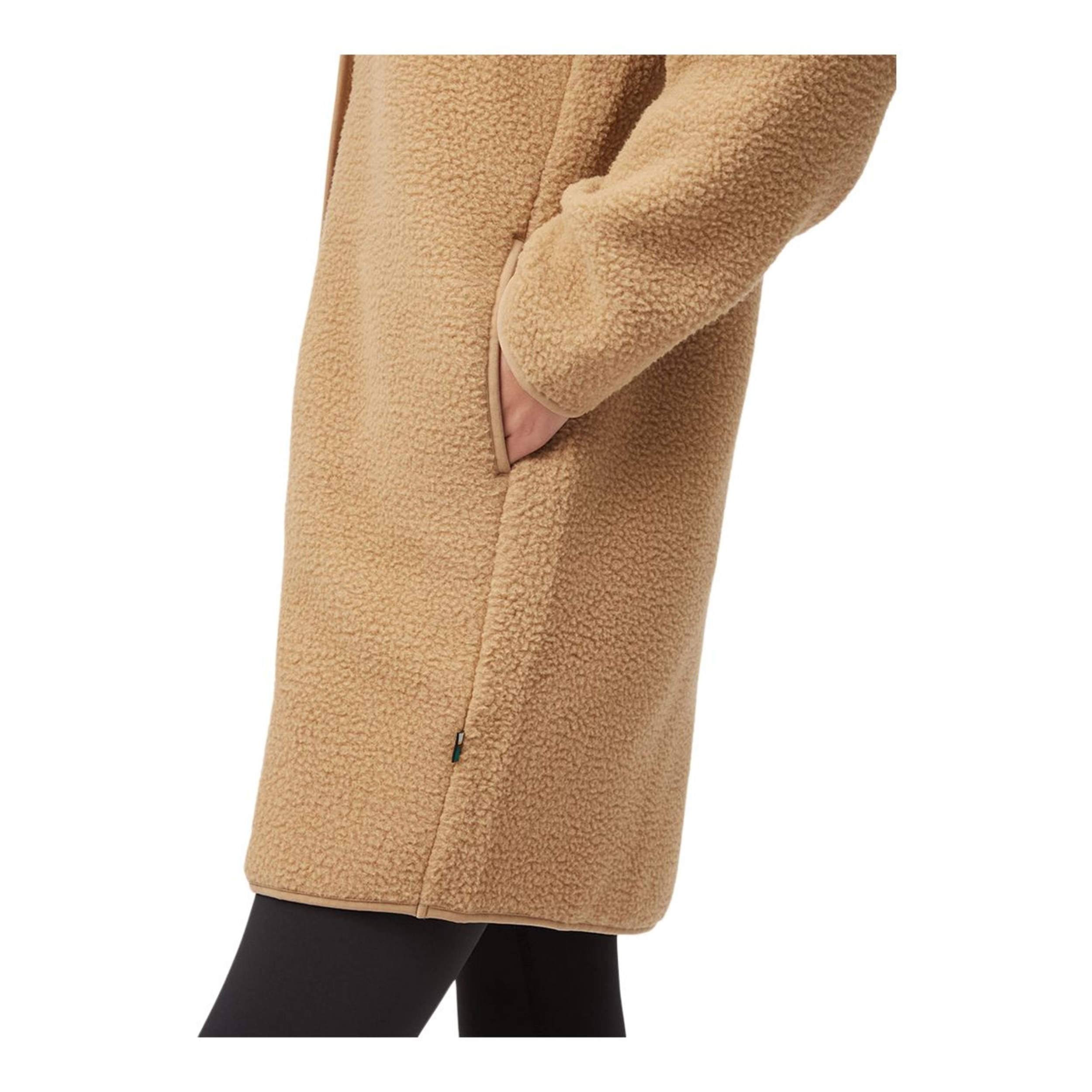 The Tentree Women's Ecoloft Longline Multisport Jacket combines cozy warmth with sustainable style. Featuring a plush sherpa design with snap closures and on-seam pockets, this relaxed-fit jacket ensures comfort and practicality. The cork hem label adds a unique touch to the Tentree jacket's eco-friendly appeal.