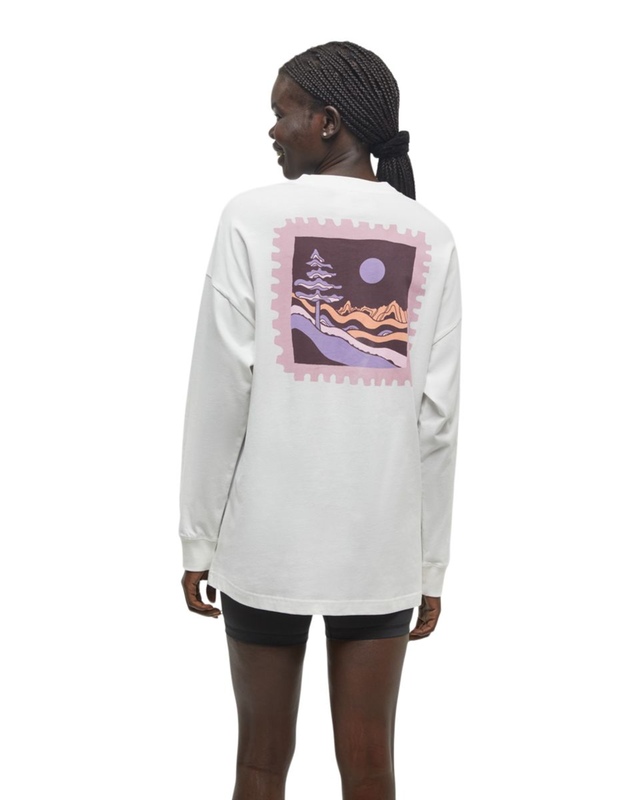 The Tentree Women's Emerald Edge Oversized Long Sleeve T Shirt is a relaxed, oversized top made from a soft, stretchy knit fabric with a peached finish. Perfect for lounging at home or casual weekend wear, this boxy tee features a printed graphic on the front and back, drop shoulder seams, and ribbed neckline and cuffs for a stylish yet comfy look. Tentree's commitment to sustainability means a tree is planted for every item purchased.
