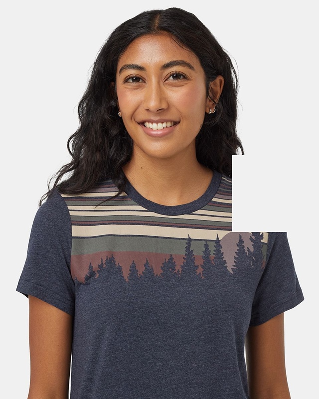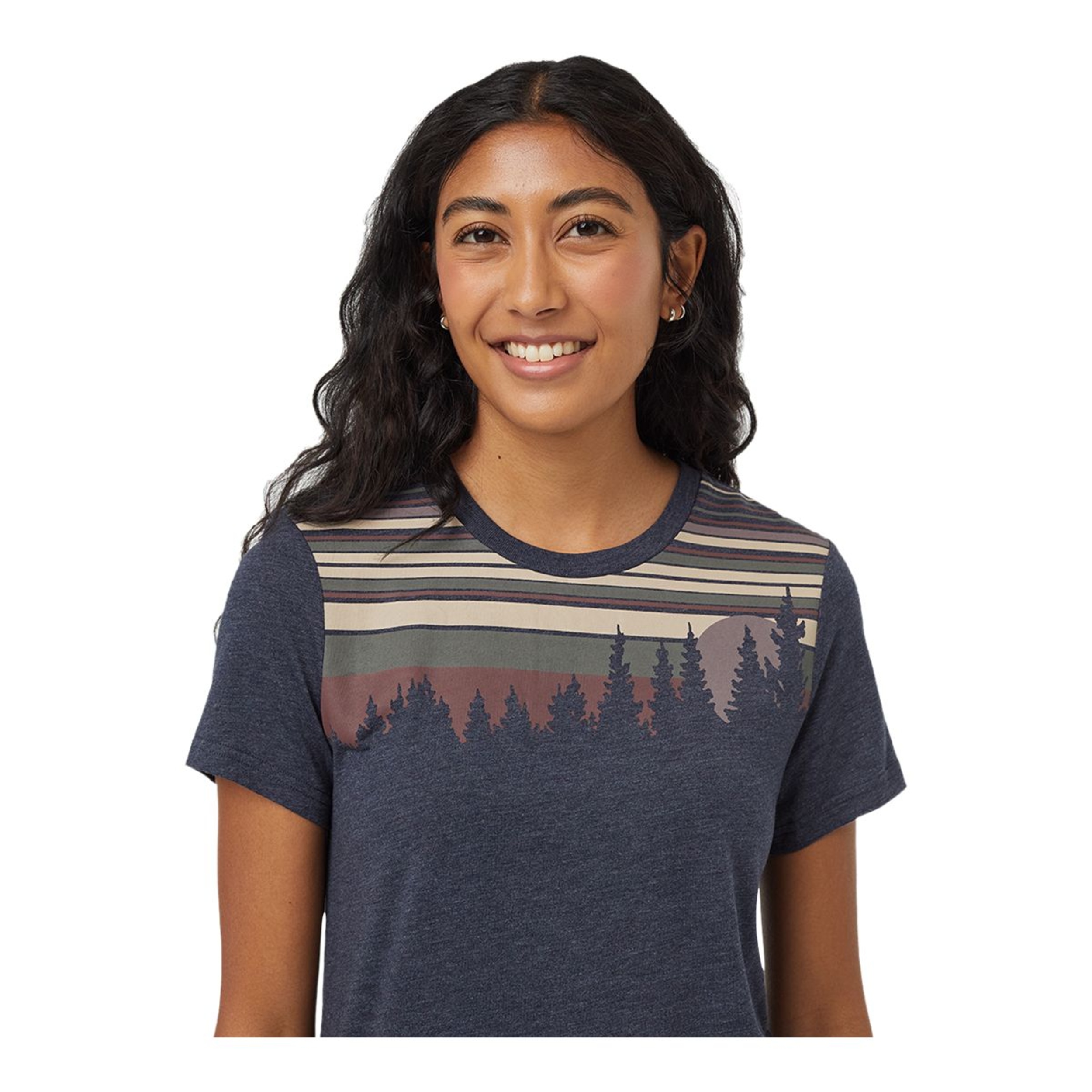 The Tentree Women's Retro Juniper T Shirt showcases a colourful, retro-inspired Juniper treeline graphic across the chest. This sustainable fashion essential features a classic crew neckline and short sleeves, crafted from a soft knit fabric with a touch of stretch for all-day comfort. The eye-catching graphic and relaxed fit make it the perfect top to enliven your casual wardrobe.