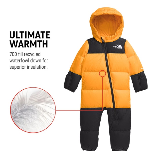 Inspired by the iconic 1996 jacket, The North Face Kids' 96 Retro Nuptse One Piece Suit offers full-body warmth for little ones. With 700-fill-down insulation and recycled materials, it features retro logos, an attached hood, and fold-over mitts. The asymmetrical zip and chin guard makes it easy to wear, making this Nuptse suit perfect for cold-weather adventures.