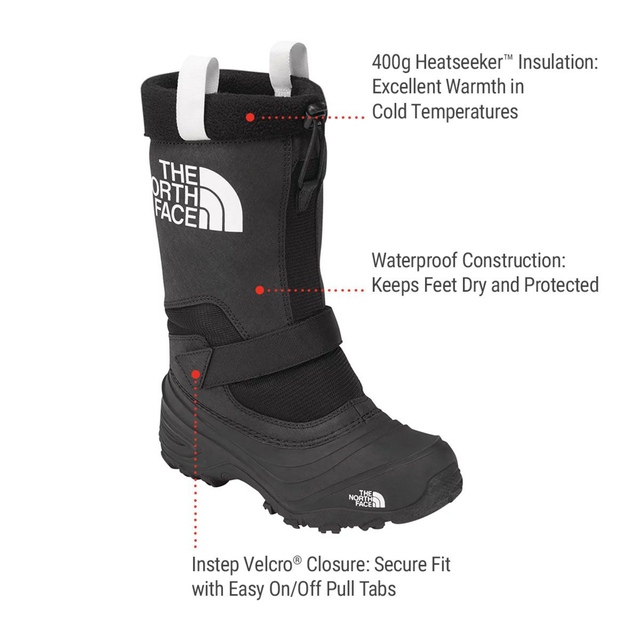 Designed for all-day fun in the snow, The North Face Kids' Alpenglow Extreme III Winter Boots offer lightweight warmth and waterproof protection. These boots feature a durable waterproof-leather upper and abrasion-resistant mesh, making them tough enough to handle rough winter play. They provide superior warmth and traction on snowy, icy surfaces. The convenient pull-on design with a drawcord closure helps keep snow out, ensuring kids stay dry and comfortable in harsh winter conditions.