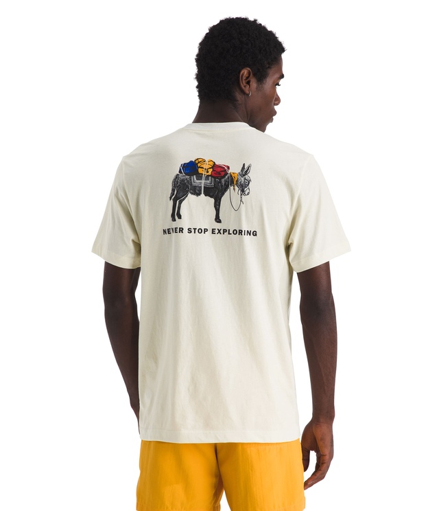 The North Face Men's Pack T-Shirt blends comfort and style. Made from high-quality organic cotton, this tee features a relaxed fit and a classic crew neck. The stylish design includes a heat-transfer logo on the chest and a graphic detail on the back, making it a versatile addition to any wardrobe.