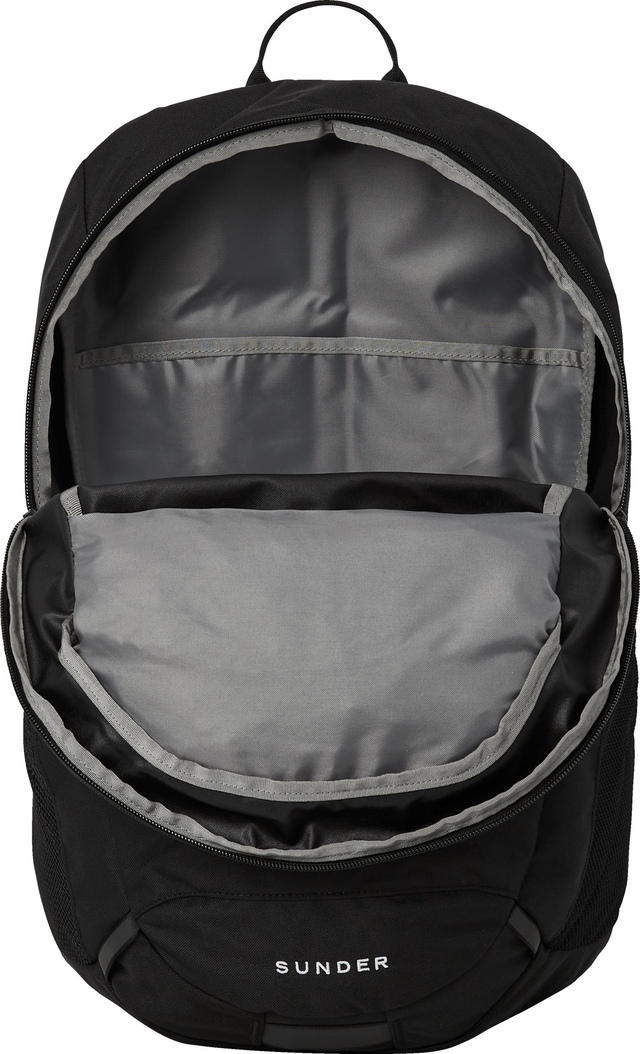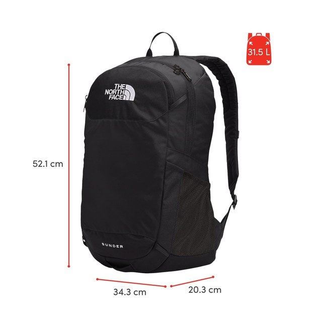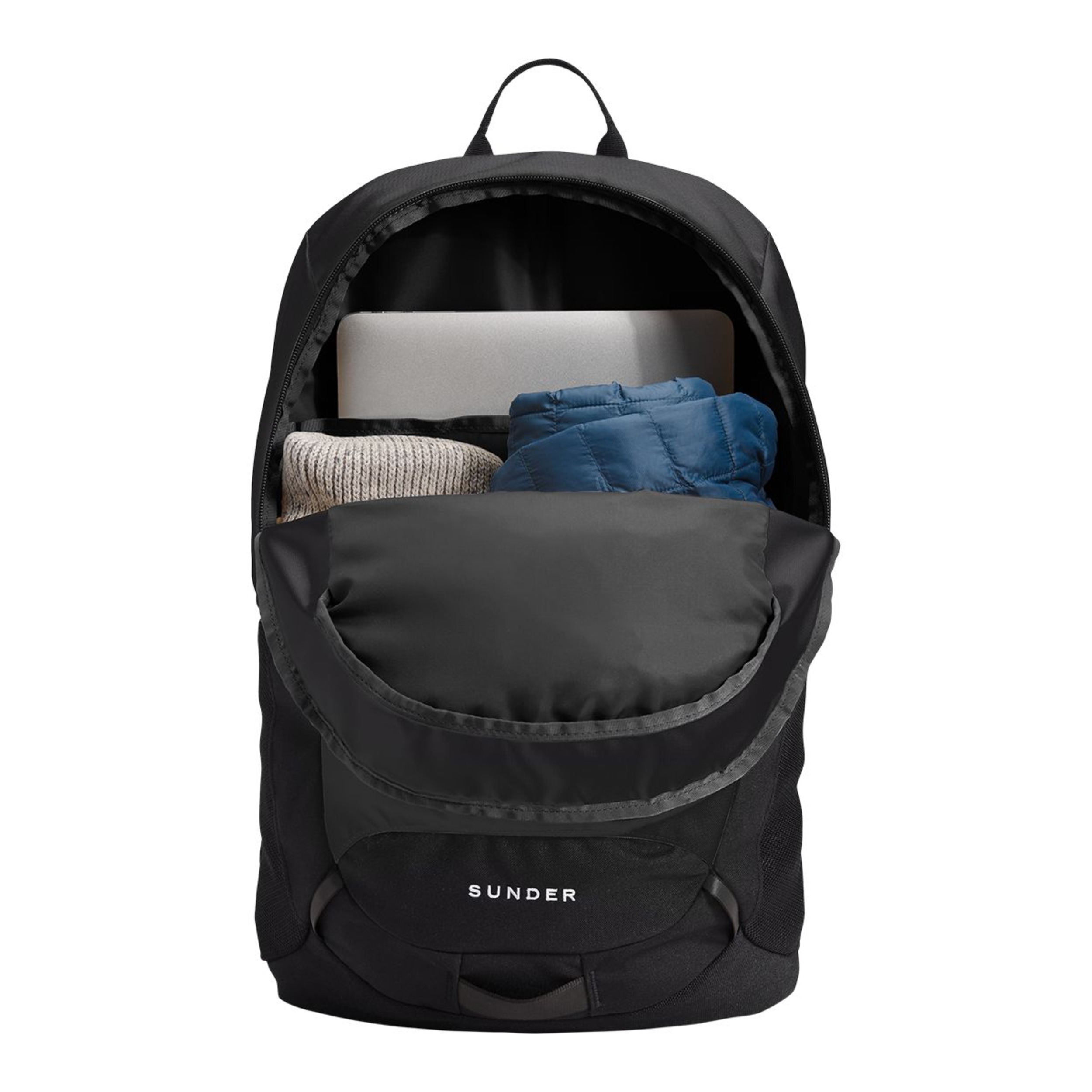 The North Face Sunder Backpack features a stand-up design and a padded 15" laptop sleeve. Its spacious main compartment, external secure-zip pocket and two stretch-mesh water bottle pockets enhance accessibility and organization. The North Face backpack has a top grab handle and 360-degree reflectivity for added safety.