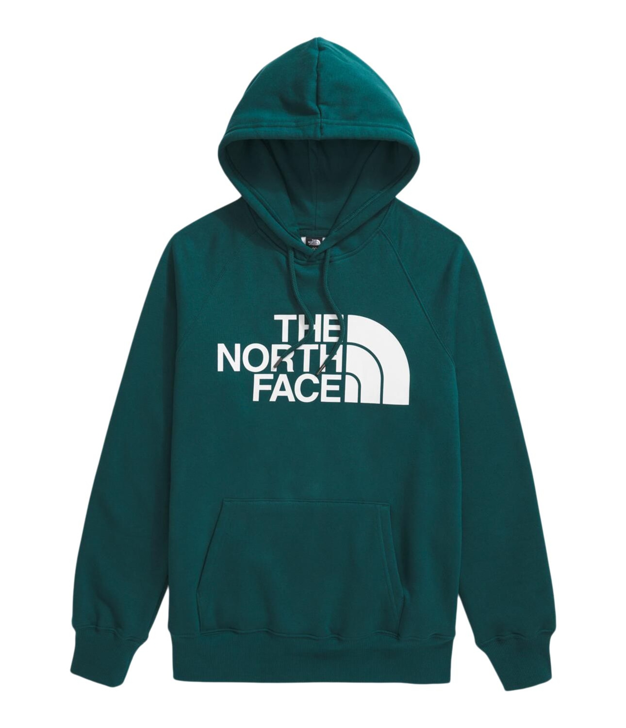 The North Face Women's Half Dome Pullover Hoodie is a versatile casual sweatshirt designed for cozy comfort and relaxed everyday wear. This pullover features an adjustable two-piece hood with a drawcord that allows you to customize coverage. It showcases distinctive The North Face branding with a water-based screen-printed logo on the left chest and graphic on the back. Ribbed cuffs and hem help provide a snug yet flexible fit, while the kangaroo hand pocket offers convenient hand-warming. Raglan sleeves ensure unrestricted arm mobility.