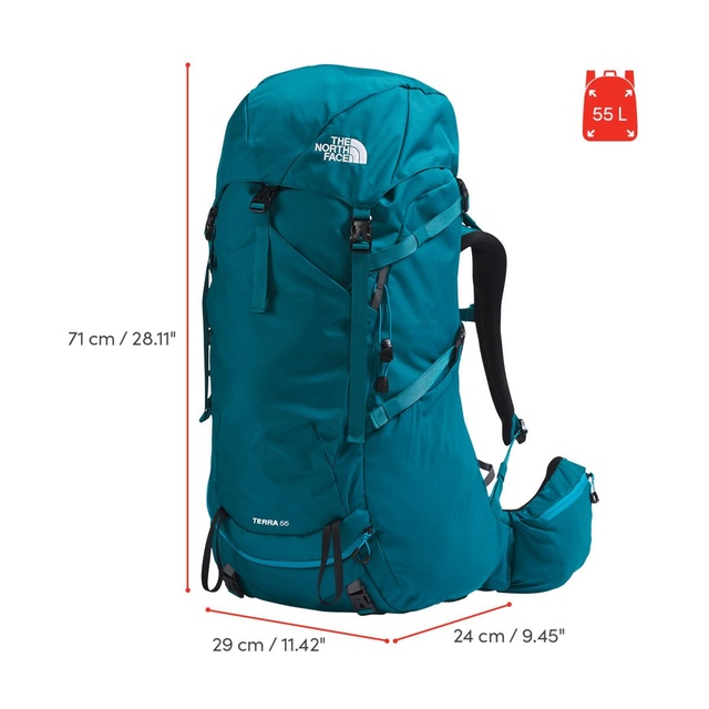 Stay organized as you explore the great outdoors with The North Face Women's Terra 55 Backpack. This backpack features a torso-height adjustment system, a generously padded hipbelt and plush, breathable shoulder straps. Its 55 L capacity, stretch side pockets, secure-zip hipbelt pockets and dedicated sleeping bag compartment make this North Face pack ideal for extended hikes.