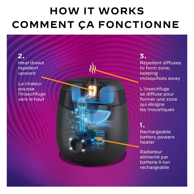 Heat-Activated Technology provides a scent-free mosquito repellent that works without chemical sprays or DEET, in just 15 minutes, without smoke or flames