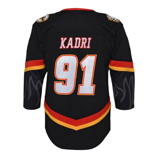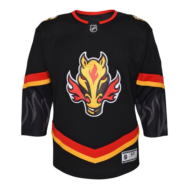 Blasty the Horse has returned on the new Calgary Flames NHL 3rd Alternate Premier black jersey. Iconic alternate logo center chest with modern design and fabrication. Complete with Nazem Kadri #91 authentic sublimated twill name and number. This is a must have jerseys for any young Flames fan. Officially licensed by the NHL. Toddler size range.