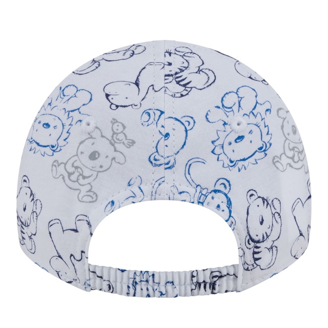 Toronto Blue Jays toddler 9TWENTY unstructured cap. Cotton fabrication with all-over print featuring cartoon zoo animals. Blue Jays primary logo embroidered on the front in full team color. Elasticized stretch strap at the back.