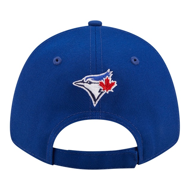 Toronto Blue Jays 9FORTY adjustable cap. This is a team color cap with a structured crown and curved visor. This is a replica of the on-field cap with an adjustable velcro strap closure at the back. Blue Jays primary logo is embroidered on the front and on the rear as well.