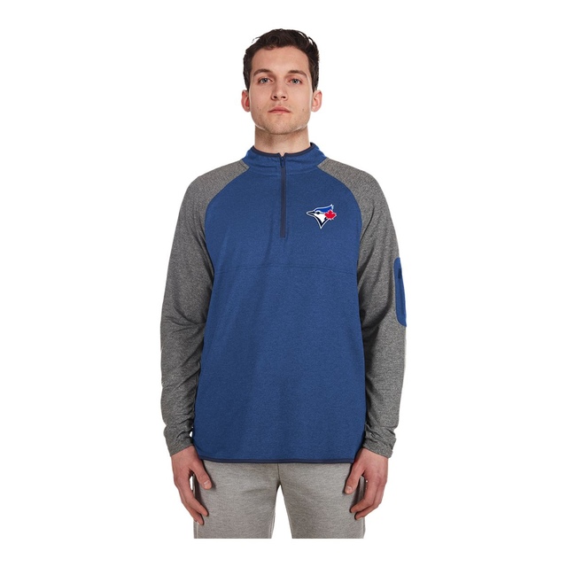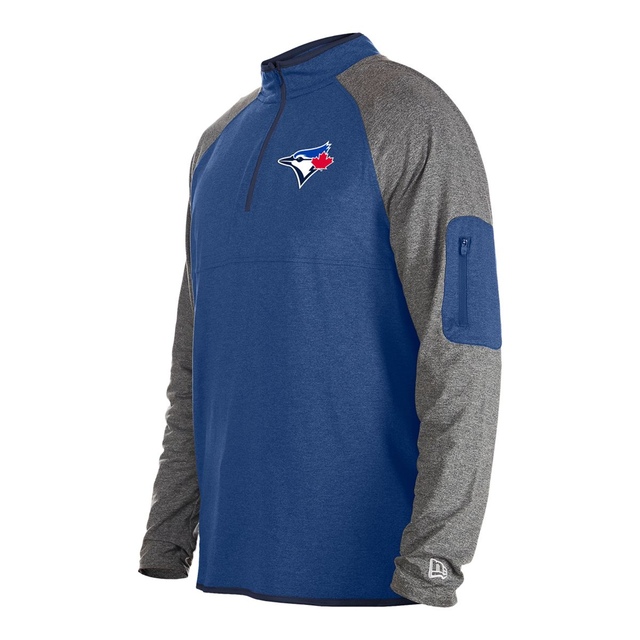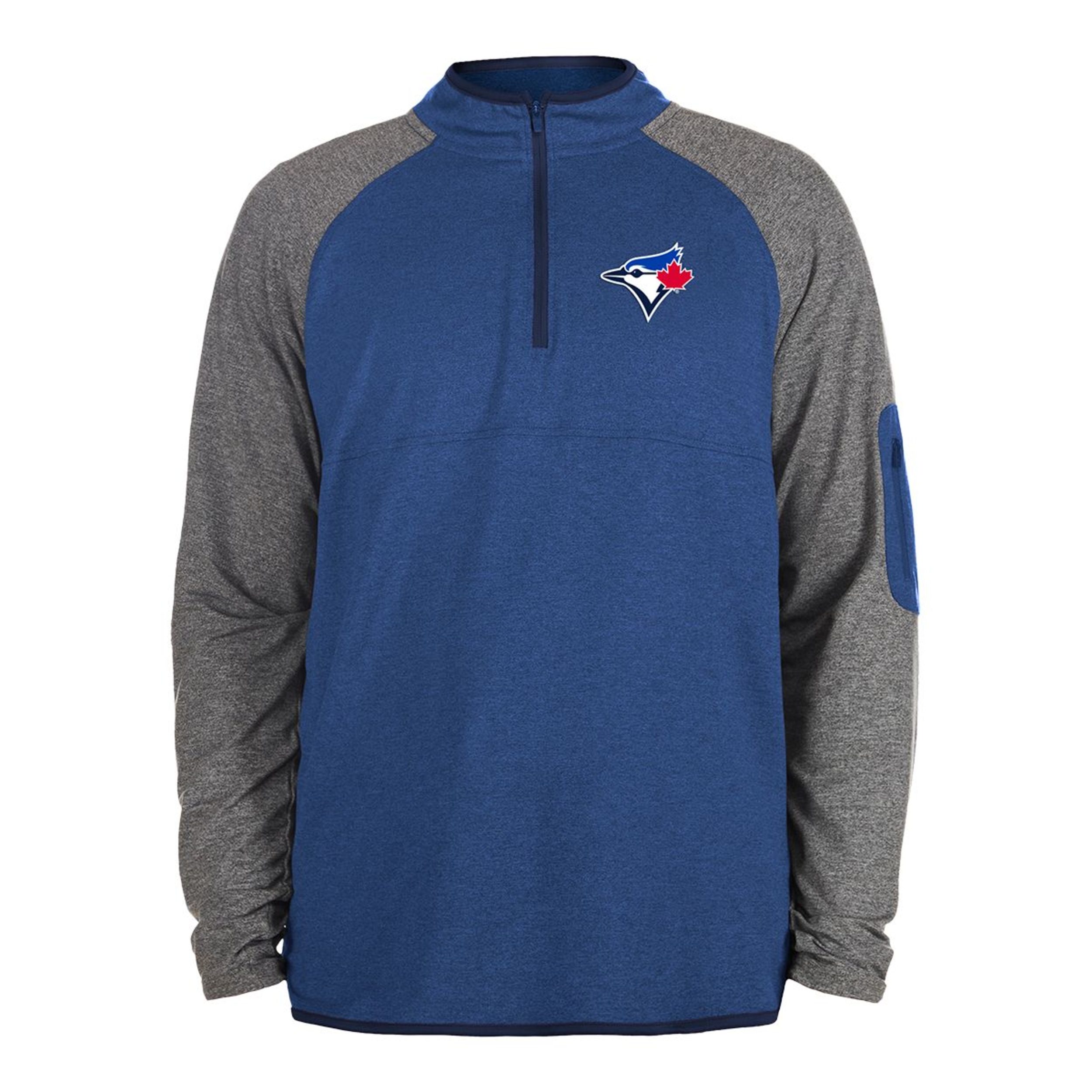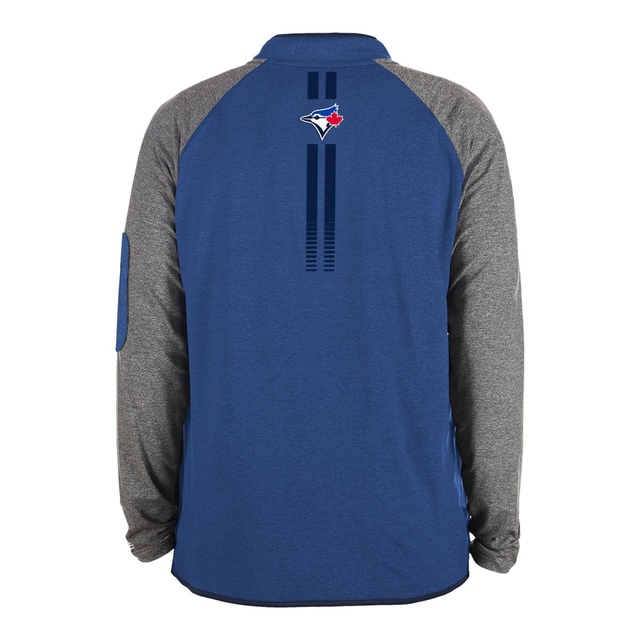 Toronto Blue Jays 1/4 zip longsleeve top. Lightweight stretchy fabric. Blue Jays primary logo screen-printed on left chest. Fashion striping with team logo on back.