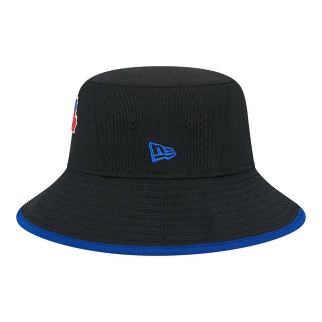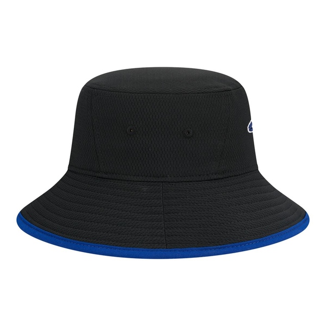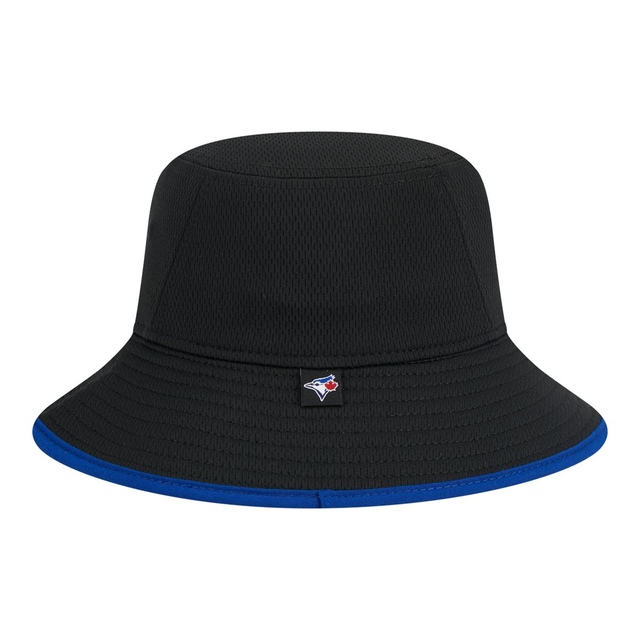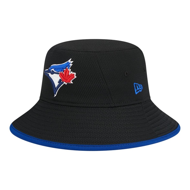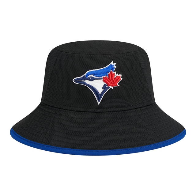 Toronto Blue Jays bucket cap. Dash-mark mesh fabric in black with team color trim around edge of brim. Blue Jays full color primary logo embroidered on the front with Jays woven tab at the back.