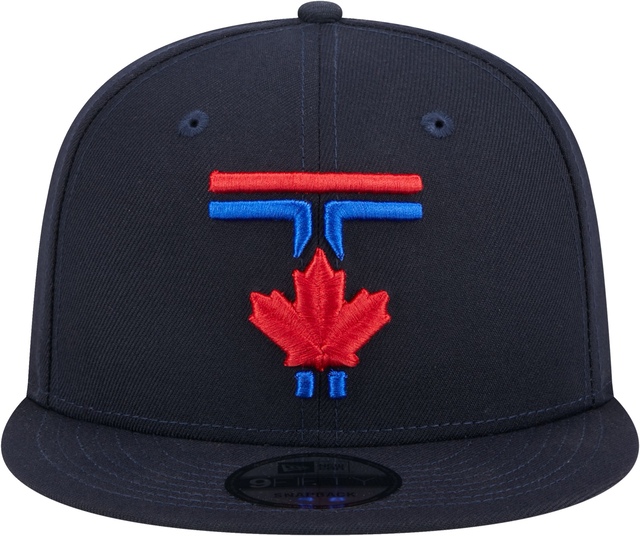 The Toronto Blue Jays 9FIFTY snap-back cap is the adjustable snap-back version of the Jays on-field City Connect caps. This dark navy cap features the double line 'T' and Maple Leaf embroidered on the front.