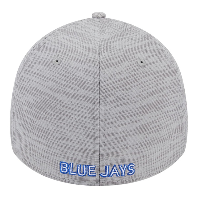 The Toronto Blue Jays 2023 Clubhouse Grey 39THIRTY Stretch fit cap features a raised molded Blue Jays patch with embroidery at the front panels with a wordmark logo at the rear and a team color undervisor.