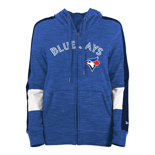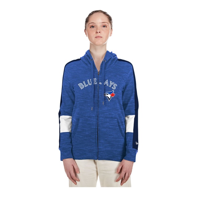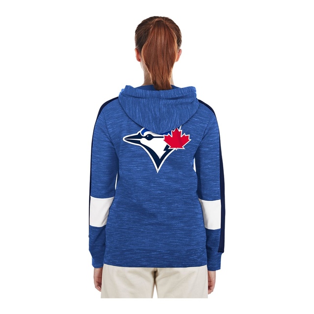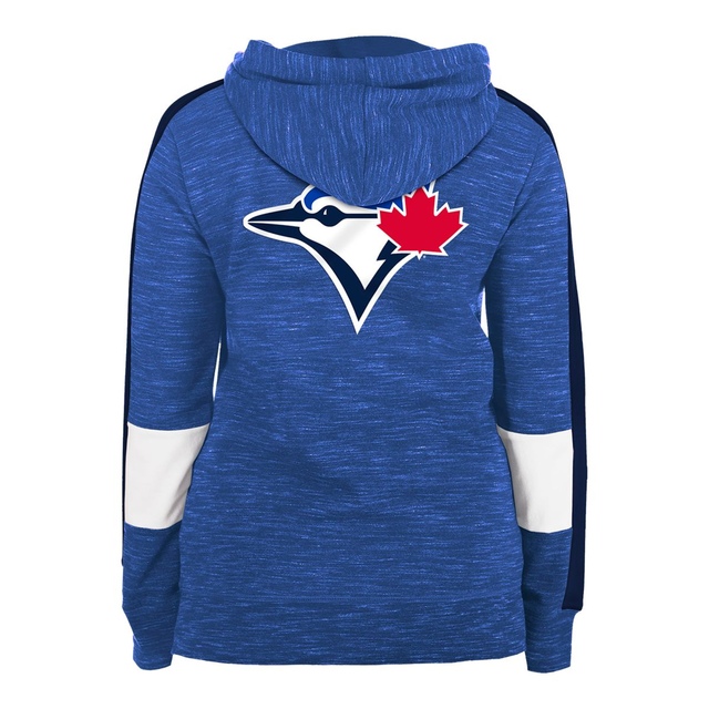 Toronto Blue Jays women's full zip hoodie. Space dye fabrication. Blue Jays jersey front design screenprinted across chest and full size primary logo printed on back. Two front pockets above waistline.