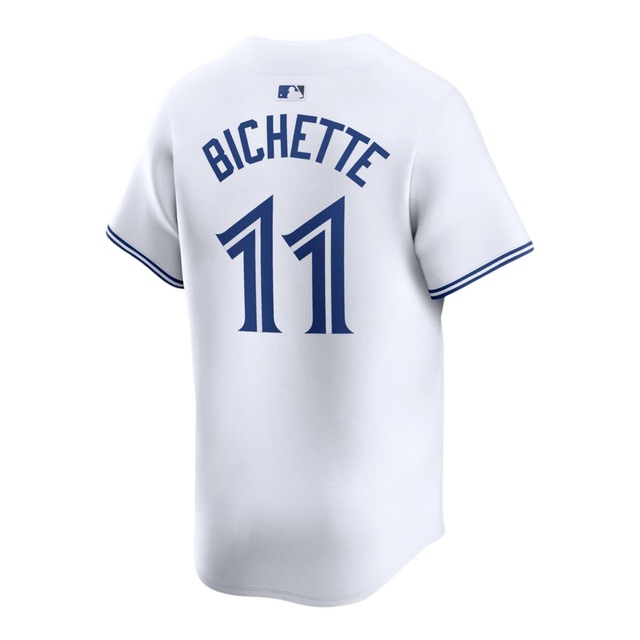 The Toronto Blue Jays Nike Bo Bichette Limited Home Jersey is a premium baseball jersey made with recycled polyester double mesh fabric for breathability. This officially licensed MLB jersey features sublimated twill decoration showcasing Bichette's name and number along with the iconic Blue Jays logo. A great choice for true fans looking to support their team in style.