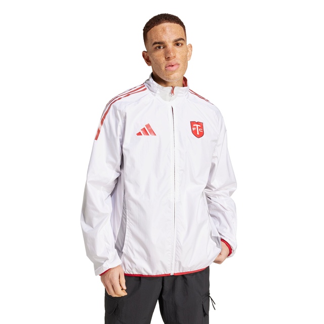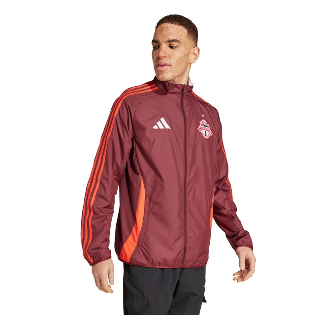 Those moments before kick-off are all about preparation and pride. When adidas designed this Toronto FC anthem jacket, they nailed the first part by using smooth ripstop fabric and giving it a slimline cut. The second part? That reversible design allows soccer players and fans to show off their club loyalty in both home and away colors. This product is made with 100% recycled materials. By reusing materials that have already been created, Adidas helps to reduce waste and its reliance on finite resources and reduce the footprint of the products Adidas makes.