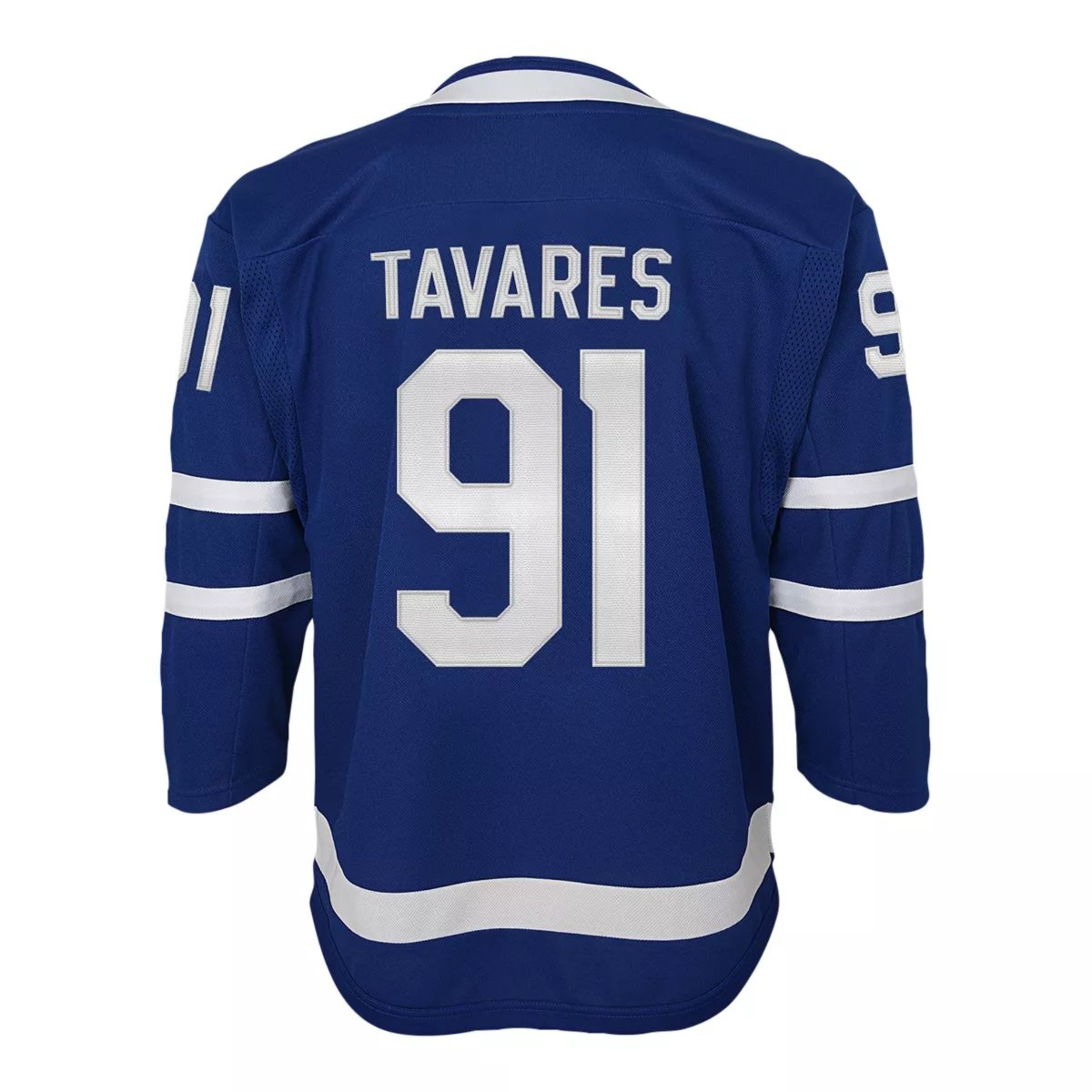 The Toronto Maple Leafs NHL Premier team color blue home jersey is a true classic. Iconic in design, color, and fabrication that pays tribute to Maple Leafs rich history. Complete with John Tavares #91 name and number. This is a must have jerseys for any young Maple Leafs fan. Officially licensed by the NHL and NHLPA. Infant 12M to 24M size range.