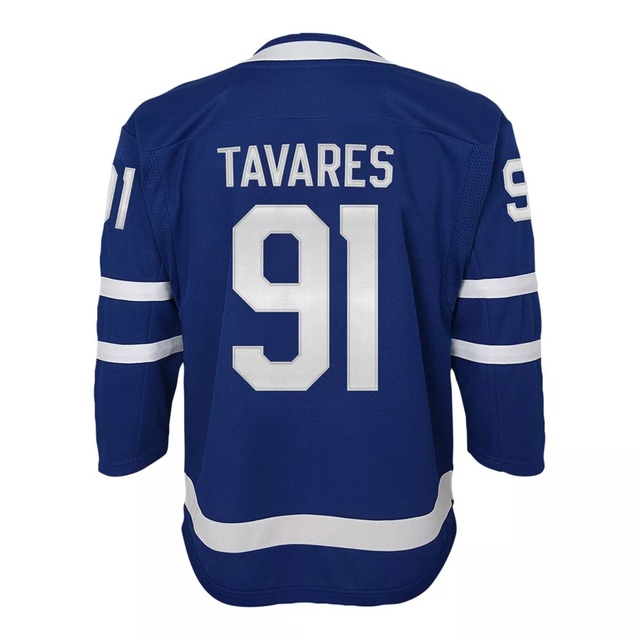 The Toronto Maple Leafs NHL Premier team color blue home jersey is a true classic. Iconic in design, color, and fabrication that pays tribute to Maple Leafs rich history. Complete with John Tavares #91 name and number. This is a must have jerseys for any young Maple Leafs fan. Officially licensed by the NHL and NHLPA. Toddler 2T to 4T size range.