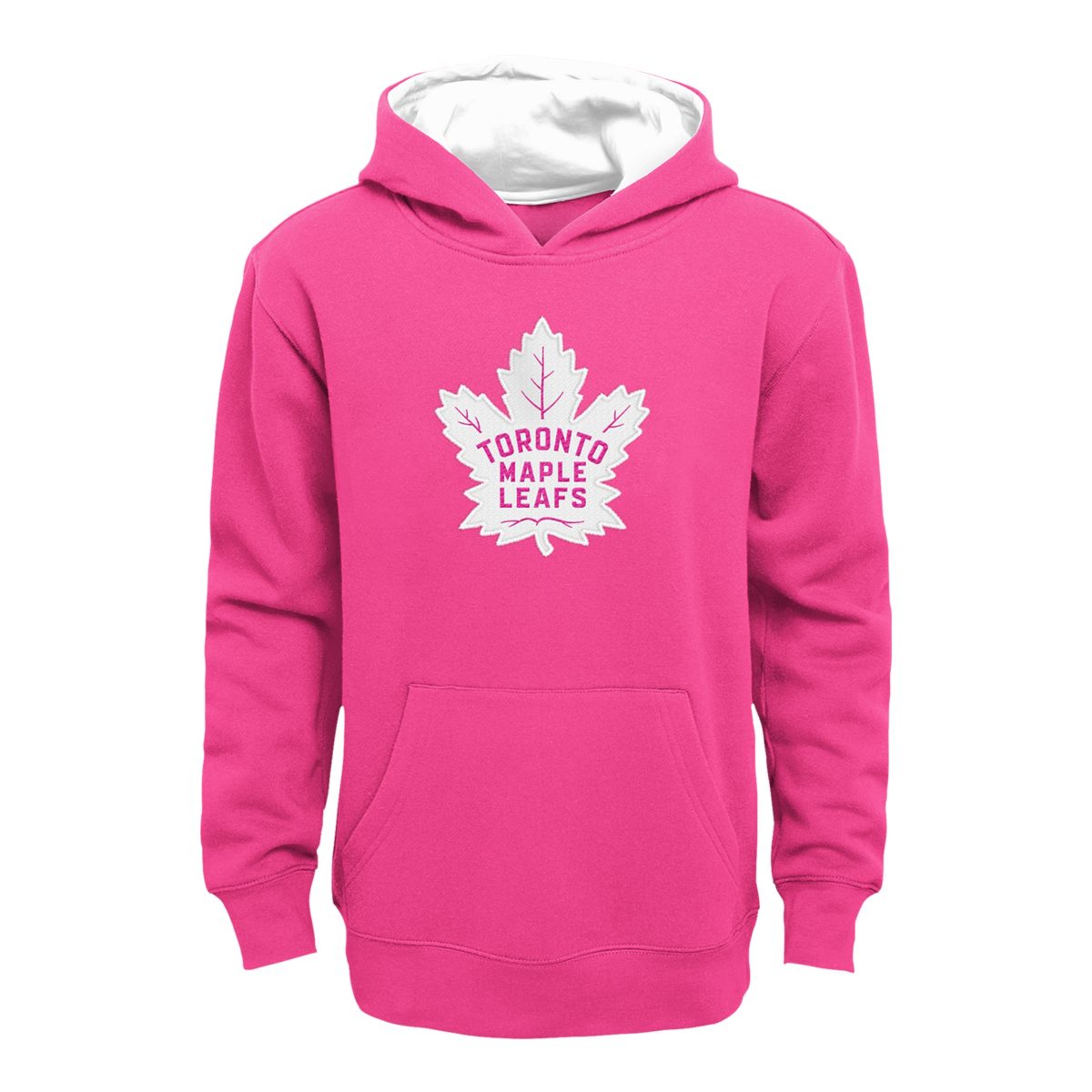 The NHL Pink Prime pullover fleece hood is a core staple for any young NHL Fan. Pink based design with a tackle twill applique team logo with embroidery at center chest. Comfortable cotton polyester blended fleece fabrication. Kangaroo utility pocket. Contrast alternate colour jersey lined hood. Officially licensed by the NHL. Youth 8-20 size range.