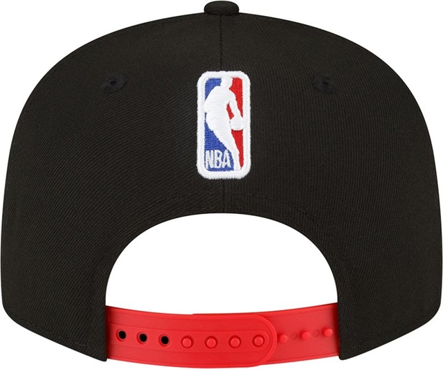 The Toronto Raptors New Era 9FIFTY Statement Cap is an all black cap that features Raptors Statement jersey logo embroidered on the front. Raptors primary logo embroidered on right side. Complete with NBA Logoman embroidered at the back above the adjustable snap closure. Grey undervisor and team colour red snap finishes the look.