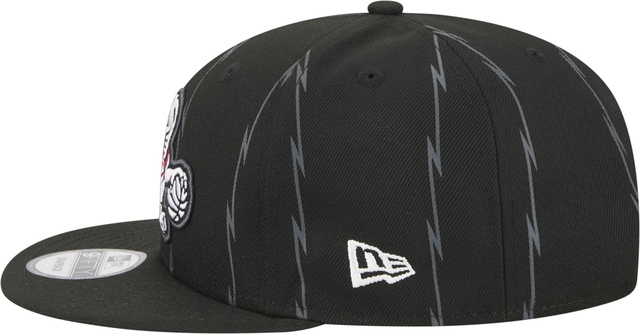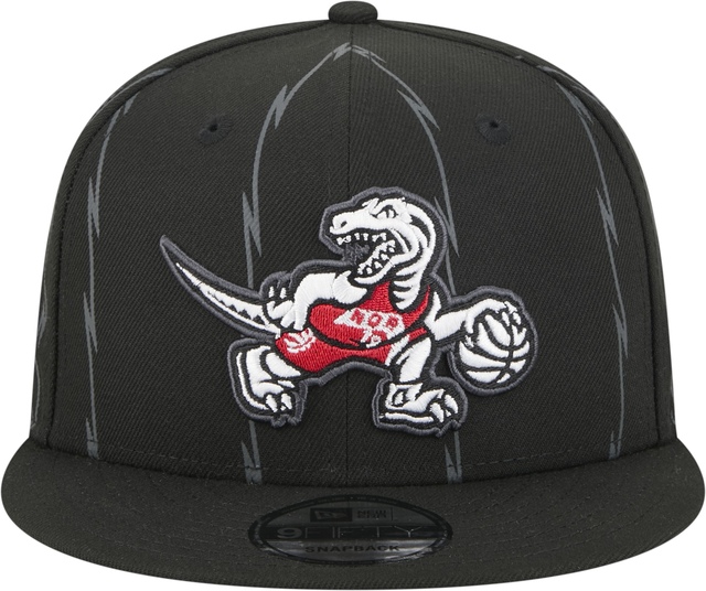 Capture your team's distinct identity in a bold way with this Toronto Raptors City Edition cap. This blacked out, 9FIFTY snap-back features tonal jersey striping throughout the crown. The Raptors Dino logo is embroidered on the front, with the "TR" in Raptors wordmark font, on the right side. The NBA Logoman is embroidered at the back above the opening with the adjustable plastic snap closure. Before you head out under the city lights, grab this incredible cap to showcase your unwavering pride and cheer on your squad.
