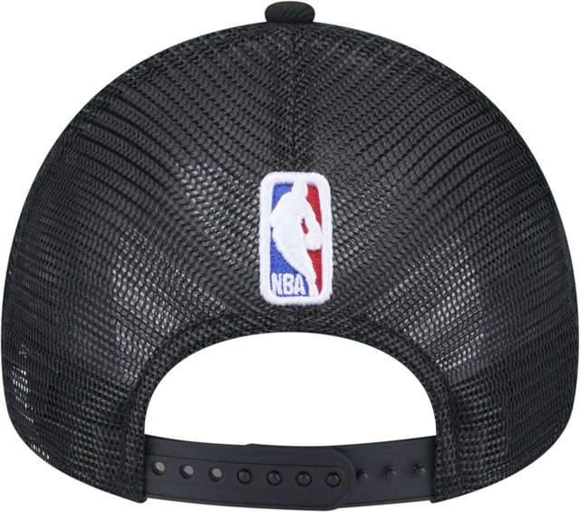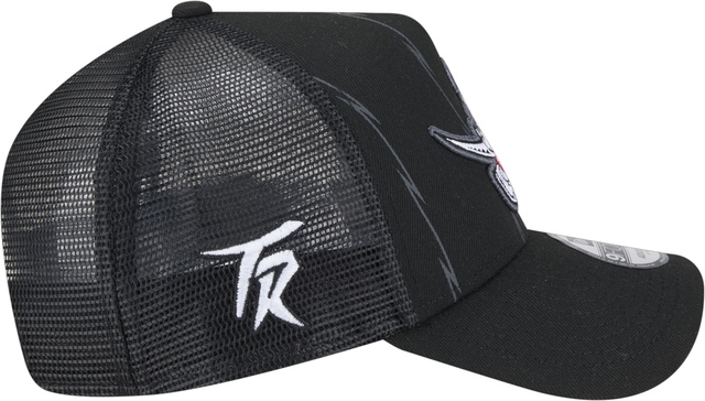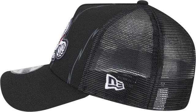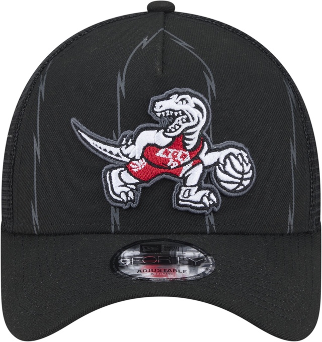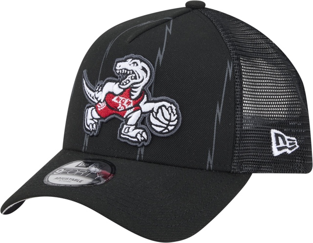 Capture your team's distinct identity in a bold way with this Toronto Raptors City Edition cap. This blacked out, 9FORTY A-Frame Trucker features tonal jersey striping on the front panels and trucker mesh mids and rears. The Raptors Dino logo is embroidered on the front, with the "TR" in Raptors wordmark font, on the right side. The NBA Logoman is embroidered at the back above the opening with the adjustable plastic snap closure. Before you head out under the city lights, grab this incredible cap to showcase your unwavering pride and cheer on your squad.