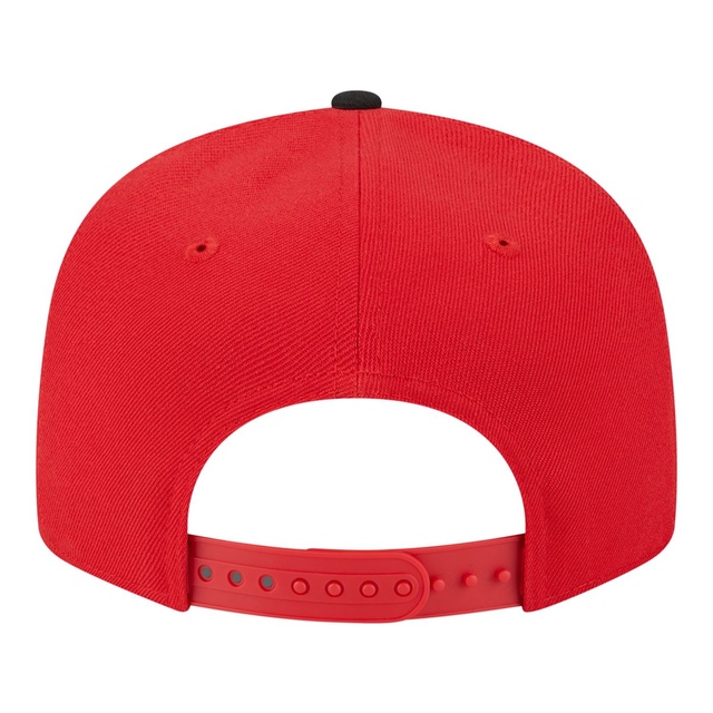 Toronto Raptors 9FIFTY snap back cap. Two tone team color cap with Raptors primary logo over large block letter team wordmark embroidered on front panels. Retro look with grey undervisor and white sweatband.