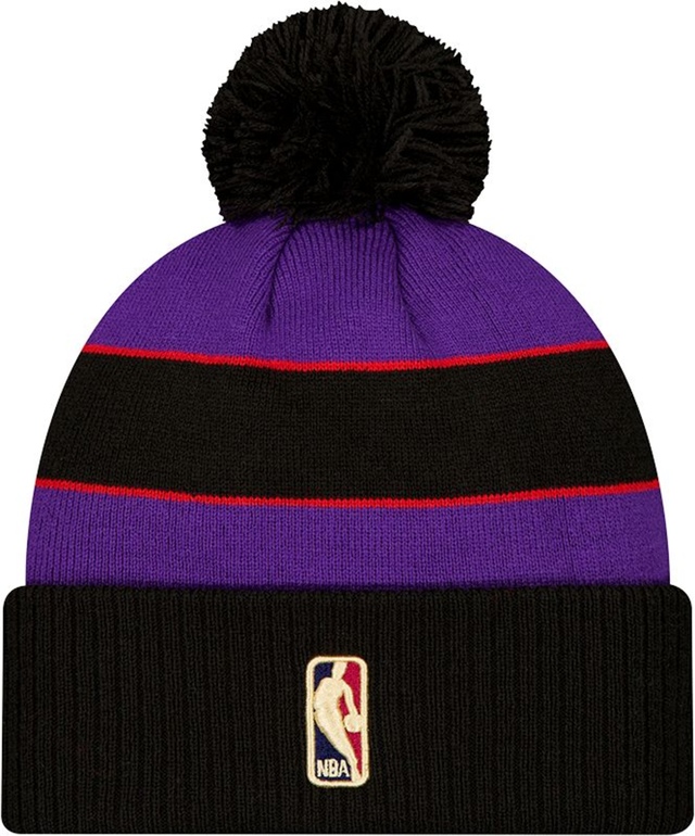 The Toronto Raptors New Era Knit Hat keeps you warm and comfortable. Retro team colour purple crown with black cuff and pom. Team colour striping runs throughout the crown. Raptors Hardwood Classics claw logo embroidered at the front, and NBA Logoman embroidered at the back.