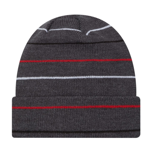Toronto Raptors cuff knit. This is a mid weight winter knit. This is thinner 2-ply acrylic, so it is warm without being bulky. Heathered graphite in color with thin team color stripes throughout. Raptors logo is embroidered on cuff.