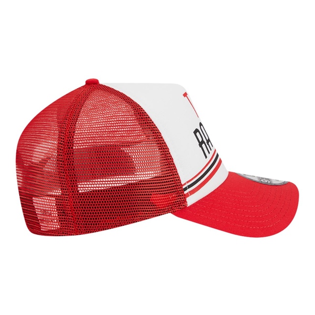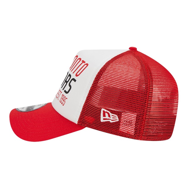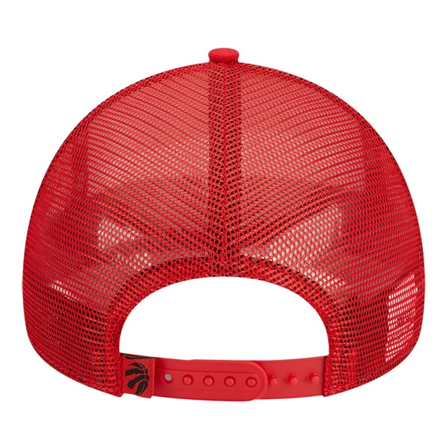 Toronto Raptors 9FORTY A-Frame Trucker cap. White foam back front panel with Raptors wordmark and established date. Red trucker mesh mid and rear panels. Adjustable plastic snap at rear closure.