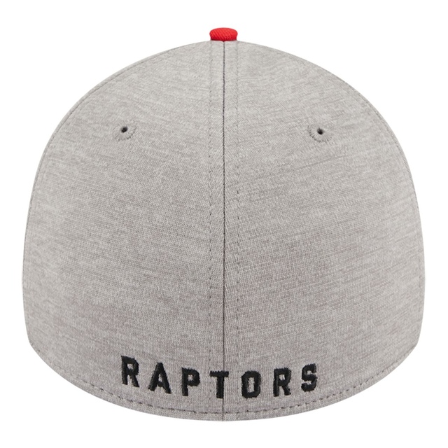 Toronto Raptors 39THIRTY stretch fit cap. Grey athletic fleece fabric throughout crown of cap. Team color visor with secondary team color stripes. Raptors primary logo embroidered on the front and wordmark at the back.