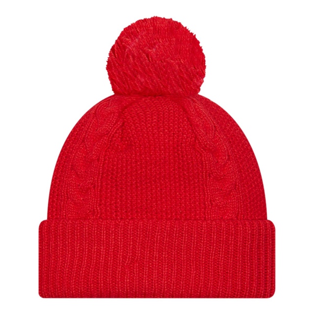 Toronto Raptors cable knit with ribbed cuff and pom. This is a 2-ply winter knit with a clean but detailed look and elevated style. Team color with Raptors logo embroidered on cuff.