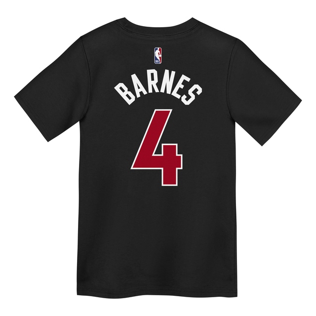 The Toronto Raptors Nike Kids' Scottie Barnes Player T Shirt is a game day essential for any fan. Designed with Scottie Barnes’ name and number in bold screen print, it features a sleek black body and a Statement graphic for a standout look. Officially licensed by the NBA, this tee delivers both comfort and team spirit.