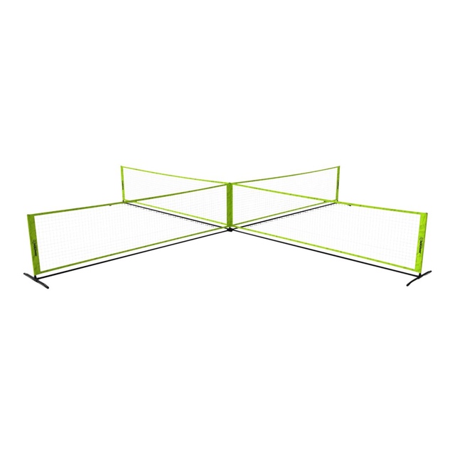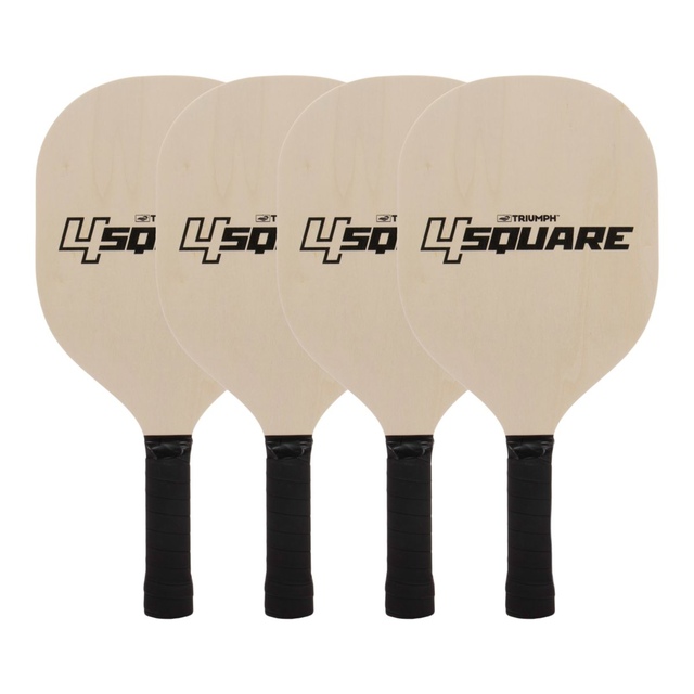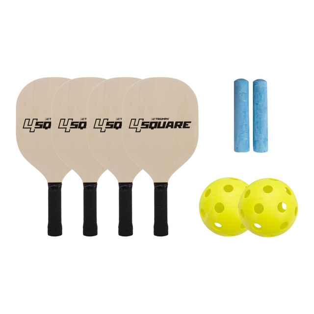 Elevate your pickleball game to new heights with the Triumph 4 Square Pickleball Set. This innovative set easily transforms from a unique four-square paddle game to regulation pickleball in just a few easy steps. With convenient spring clips, you’ll be set up and playing in no time. This full set includes a 20’ x 20’ four-way net, four wood pickleball paddles, two pickleballs, chalk to mark boundaries, and a metal frame.