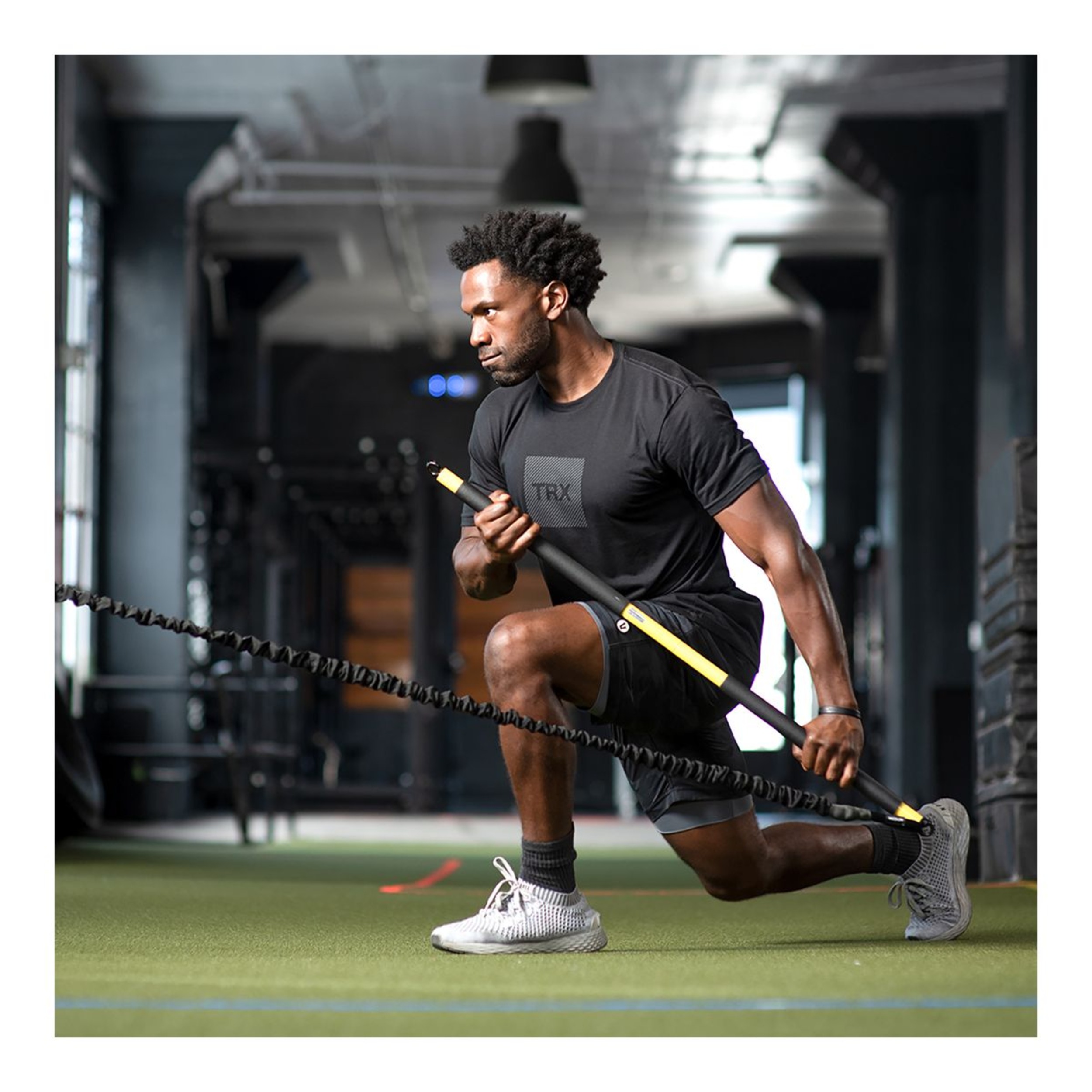 A resistance cord and weighted bar create an asymmetric load for explosive core and cardio training