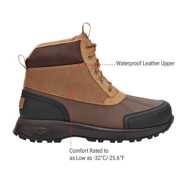 Stay warm and dry with the UGG Men's Emmett Mid Duck Winter Boots. Merging the flexibility of a sports shoe with the durability of a hiking boot, they feature a seam-sealed waterproof leather upper and a cold-weather rating of -32˚C. With a dynamic support shank and White Spider Rubber outsole, they offer exceptional traction and comfort on wet and icy surfaces.