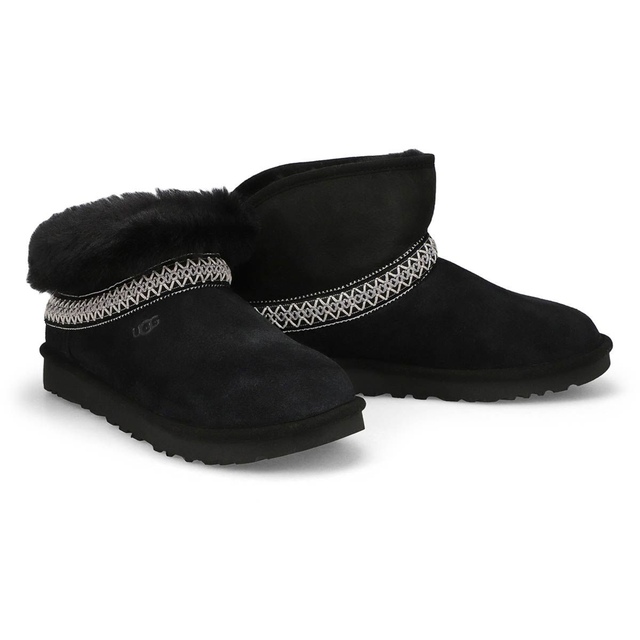The UGG Women's Classic Mini Crescent Boots takes the brand's iconic shearling boot and shrinks it down into a stylish ankle-hugging size. Though more compact, these boots retain all the signature warmth and softness you'd expect, enveloping your feet in a plush wool blend. The curvilinear "crescent" shape lends a sleek, feminine look while maintaining the classic UGG aesthetic. Pair these mini UGGs with your coziest leggings for a casual weekend look to keep warm.