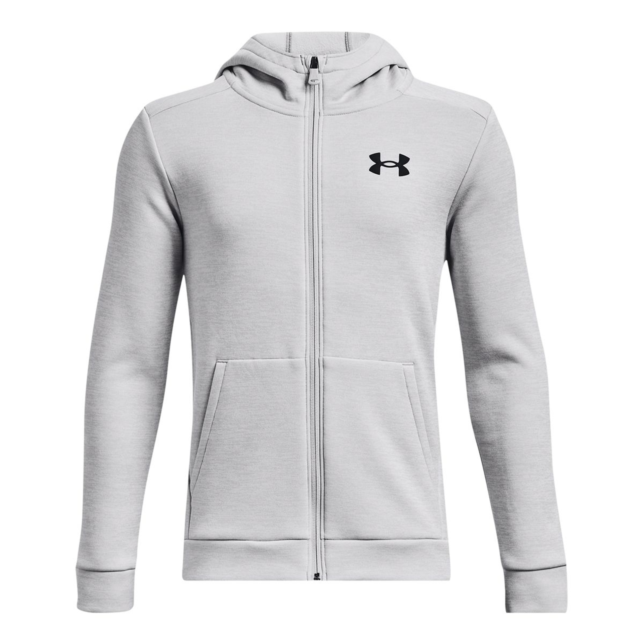 The Under Armour Boys' Armour Fleece Full Zip Hoodie is a versatile athletic essential made from signature Armour Fleece® fabric. Lightweight yet warm, it stretches for unrestricted movement during any activity. Featuring a scuba-style hood with an adjustable drawcord for customizable coverage, open hand pockets for storage, and recycled polyester construction for an eco-friendly touch.