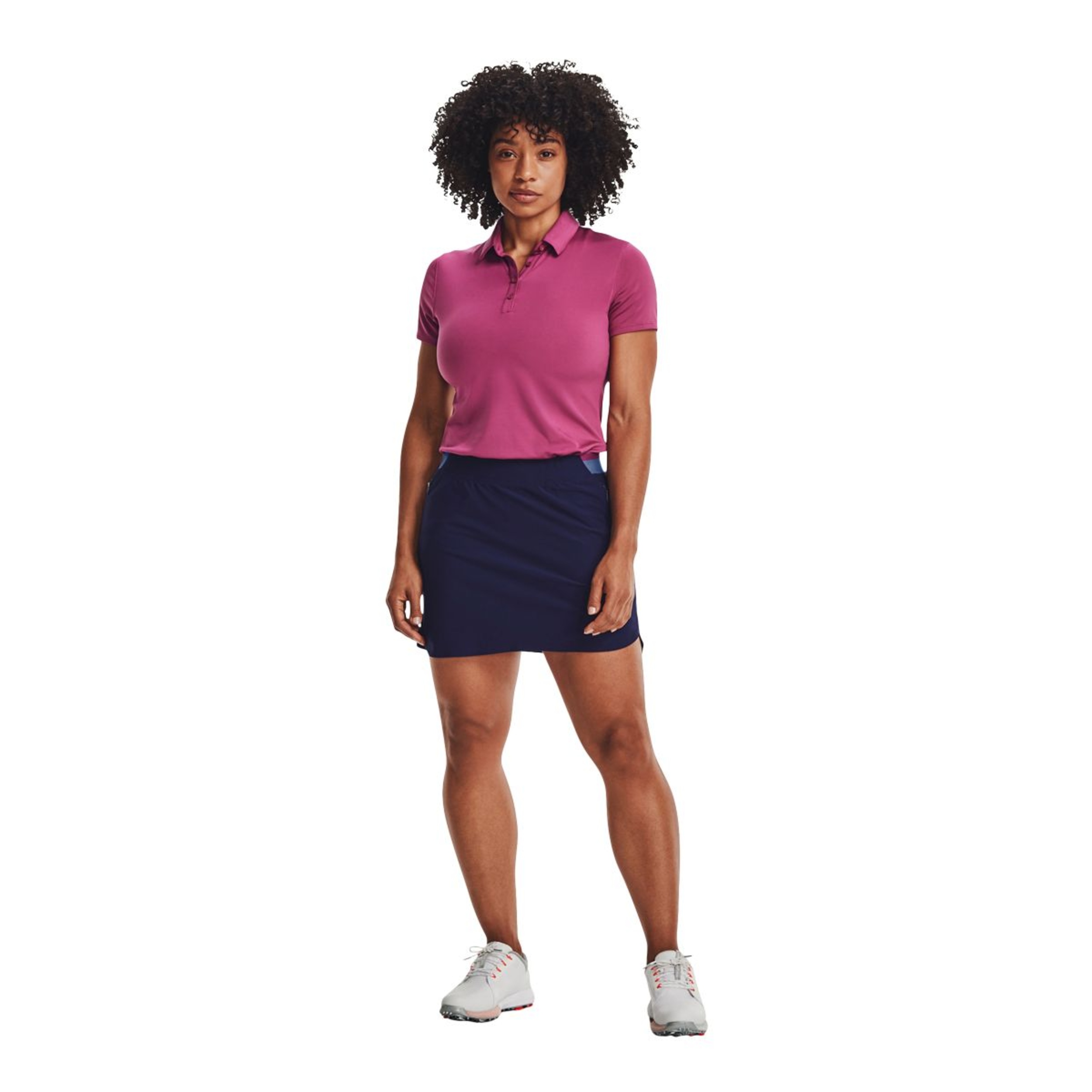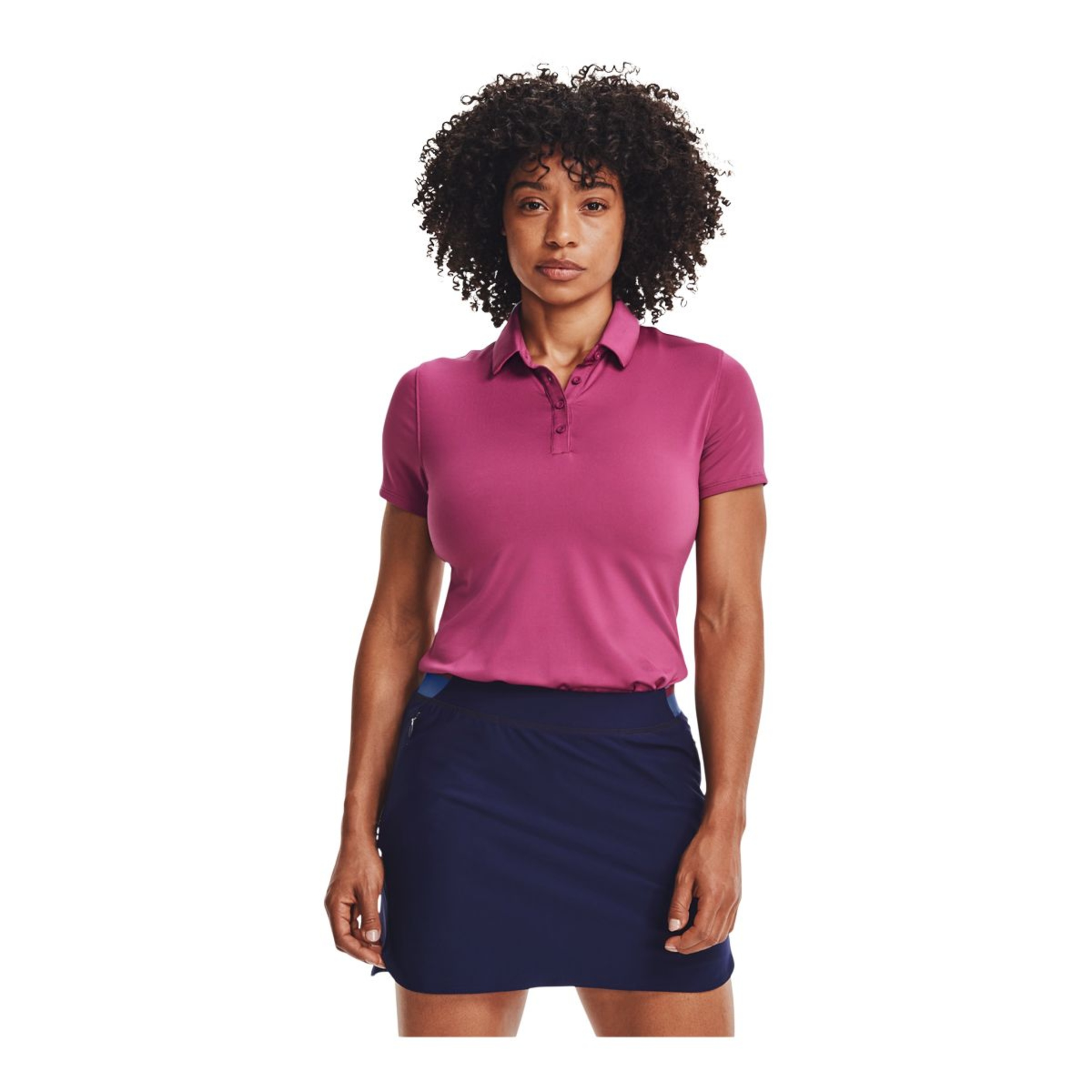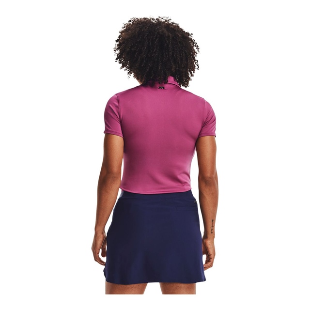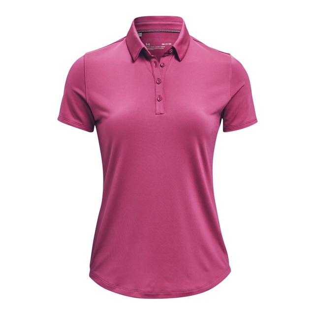 The Under Armour Golf Women's Zinger Polo is a women's golf polo shirt designed for the course. Crafted with four-way stretch construction, it offers enhanced mobility for an unrestricted swing. The moisture-wicking fabric pulls perspiration away from the skin to the surface where it can evaporate quickly, helping you stay cool and dry. An odor-fighting treatment prevents the growth of odor-causing bacteria. For outdoor protection, the fabric offers UPF 50+ to shield your skin from the sun's harmful UV rays. Additional features include a five-button placket and an anti-pick, anti-pill fabric that remains breathable and lightweight.