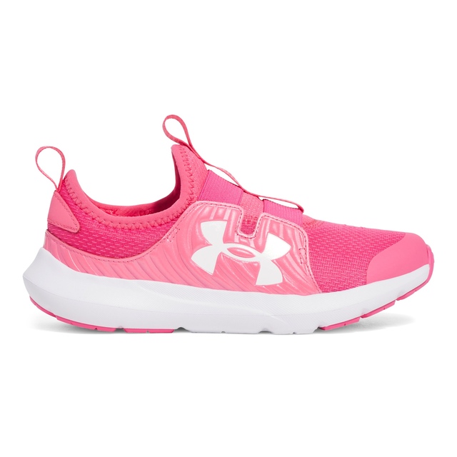 The Under Armour Kids' Grade School Outhustle 2 Slip Running Shoes feature a streamlined slip-on design for quick, easy wear. With a breathable mesh upper and leather overlays, these shoes offer durability and a secure fit. The EVA sockliner provides plush comfort, while the one-piece EVA midsole cushions impacts and supports quick transitions. Rubber pods beneath the heel and forefoot enhance traction without adding extra weight.
