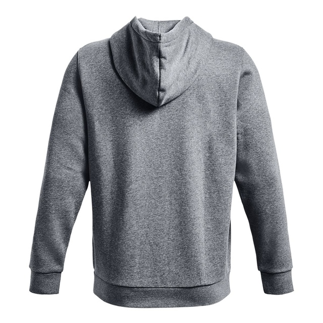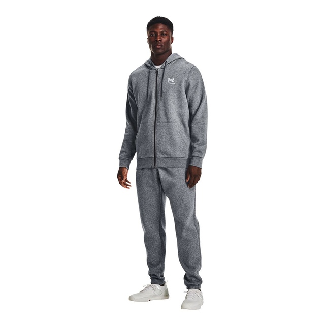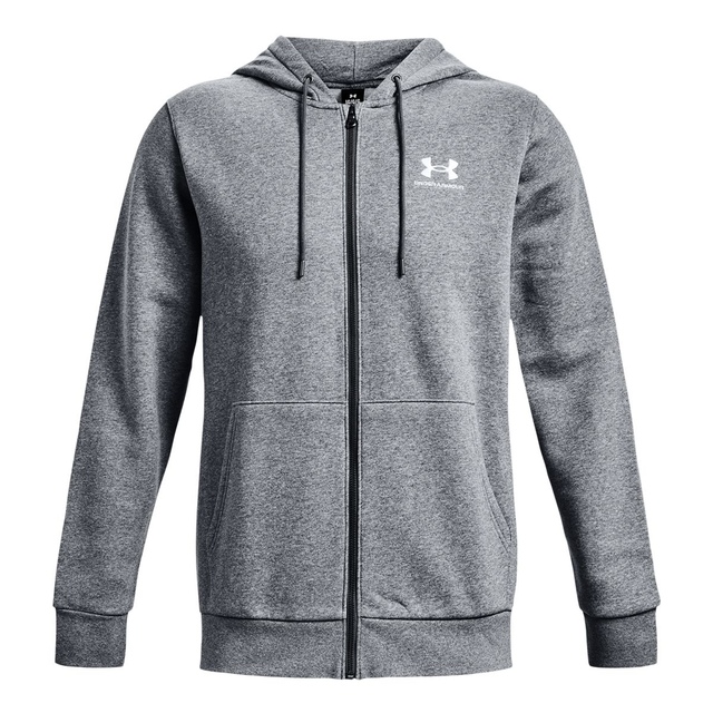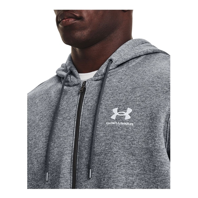 The Under Armour Men's Essential Fleece Full Zip Hoodie, designed for optimal comfort and performance. This ultra-soft, mid-weight cotton-blend fleece features a brushed interior for added warmth, front kangaroo pockets and ribbed cuffs to keep you warm during warm ups.