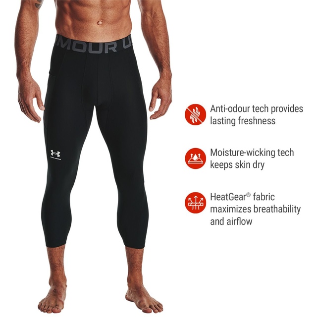 These Under Armour Men's HeatGear® 3/4 Tights offer unparalleled lightweight coverage. The super-light HeatGear® fabric offers excellent coverage without weighing you down and the strategic mesh enhances ventilation for all-day comfort. Moisture-wicking and anti-odour technologies keep you feeling fresh and dry. The wide waistband, ergonomic seams and handy strength pocket on these Under Armour tights are all designed for maximum comfort and durability.