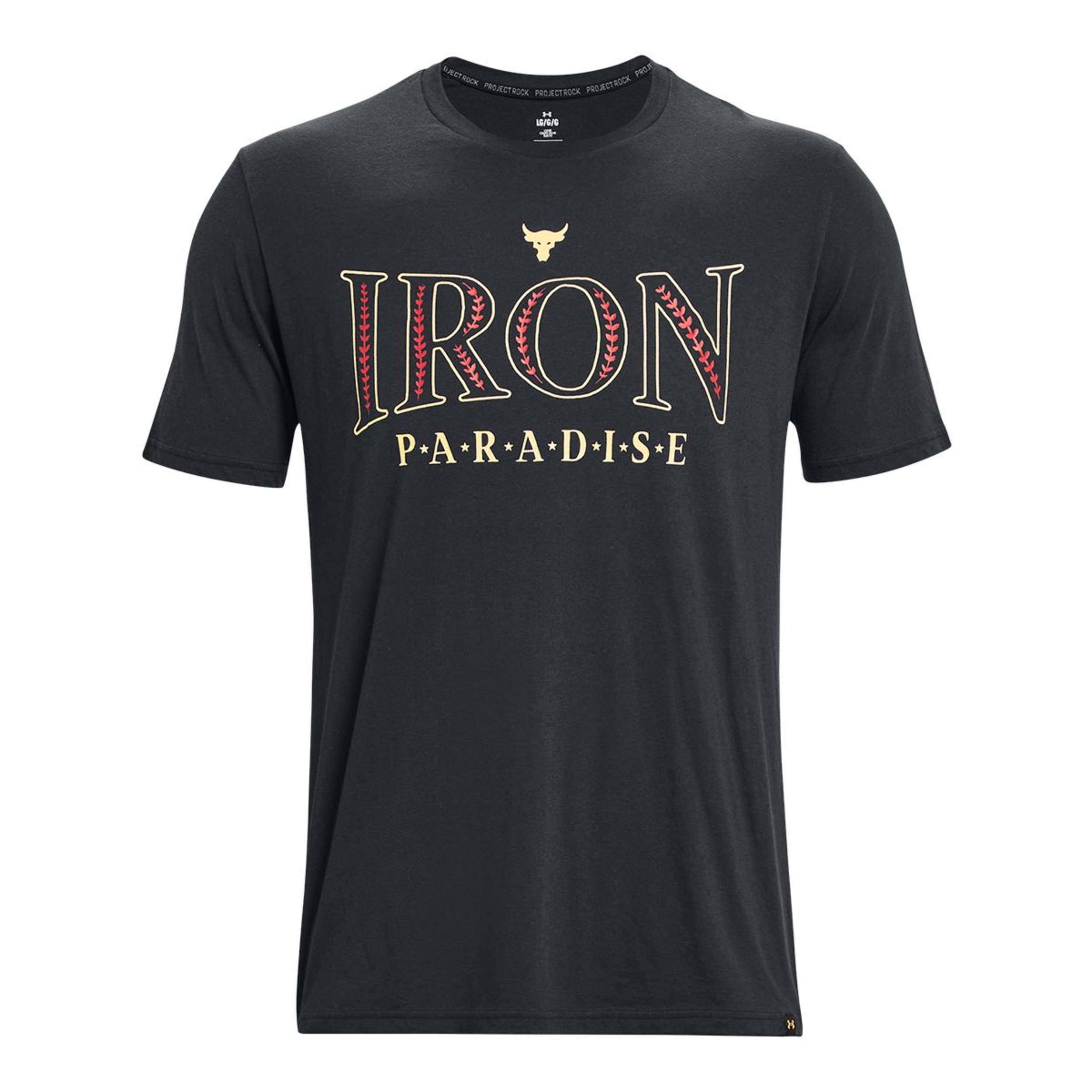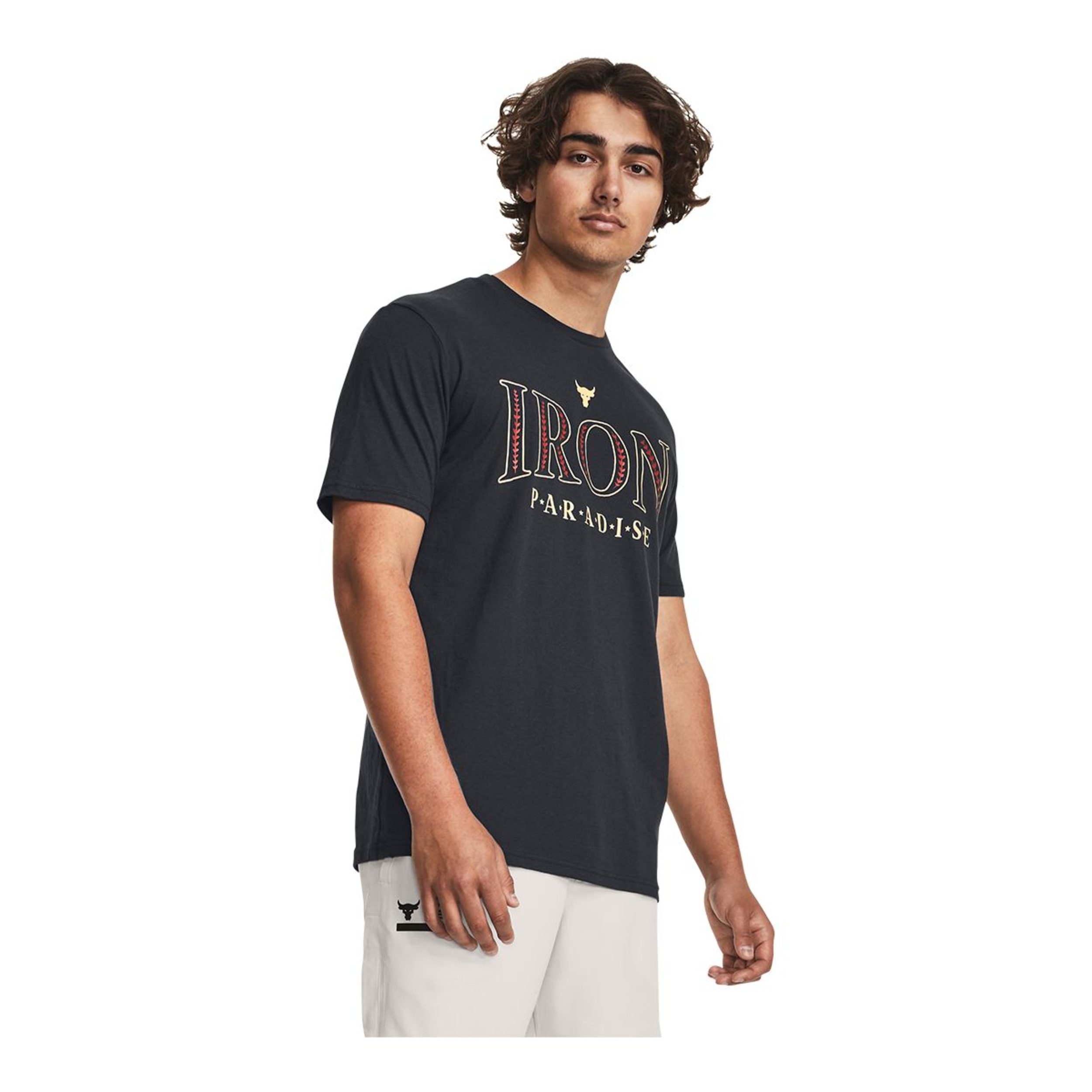 The Under Armour Men's Project Rock Iron Paradise Cotton T-Shirt, created in partnership with Dwayne Johnson, combines comfort and ultimate performance. Crafted with Charged Cotton® fabric, it has the silky texture of cotton while drying much faster. The 4-way stretch material gives you complete mobility while moisture-absorbing technology keeps you cool during tough workouts. In addition, this lightweight t shirt for men has a ribbed collar that provides a secure fit.